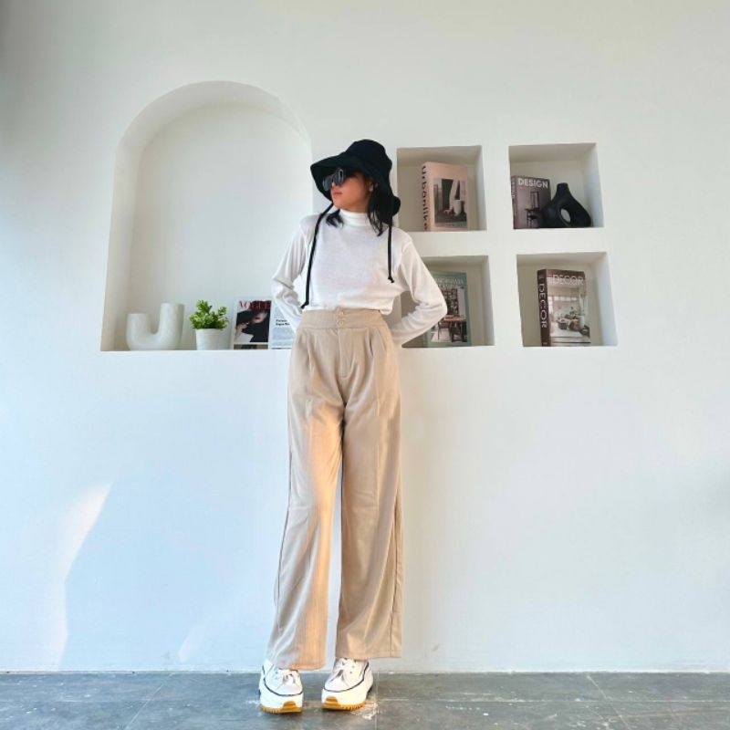 Celana Kulot Jennie Knit Pants Kancing 2 Resleting Loose Pants Wanita Highwaist