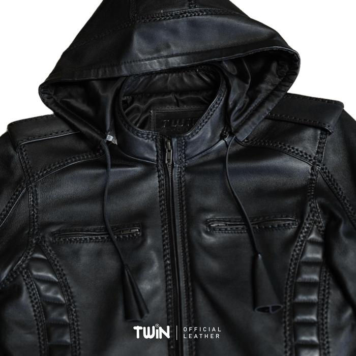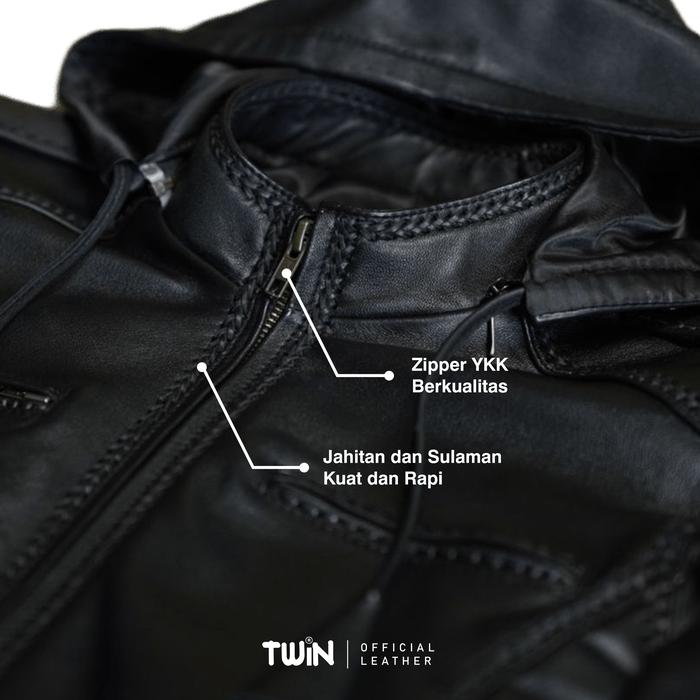 TWIN LEATHER Jaket Sulam Hoodie Kulit Domba Asli 0,8 Hitam Coklat Bahan Autentik Nyaman Desain