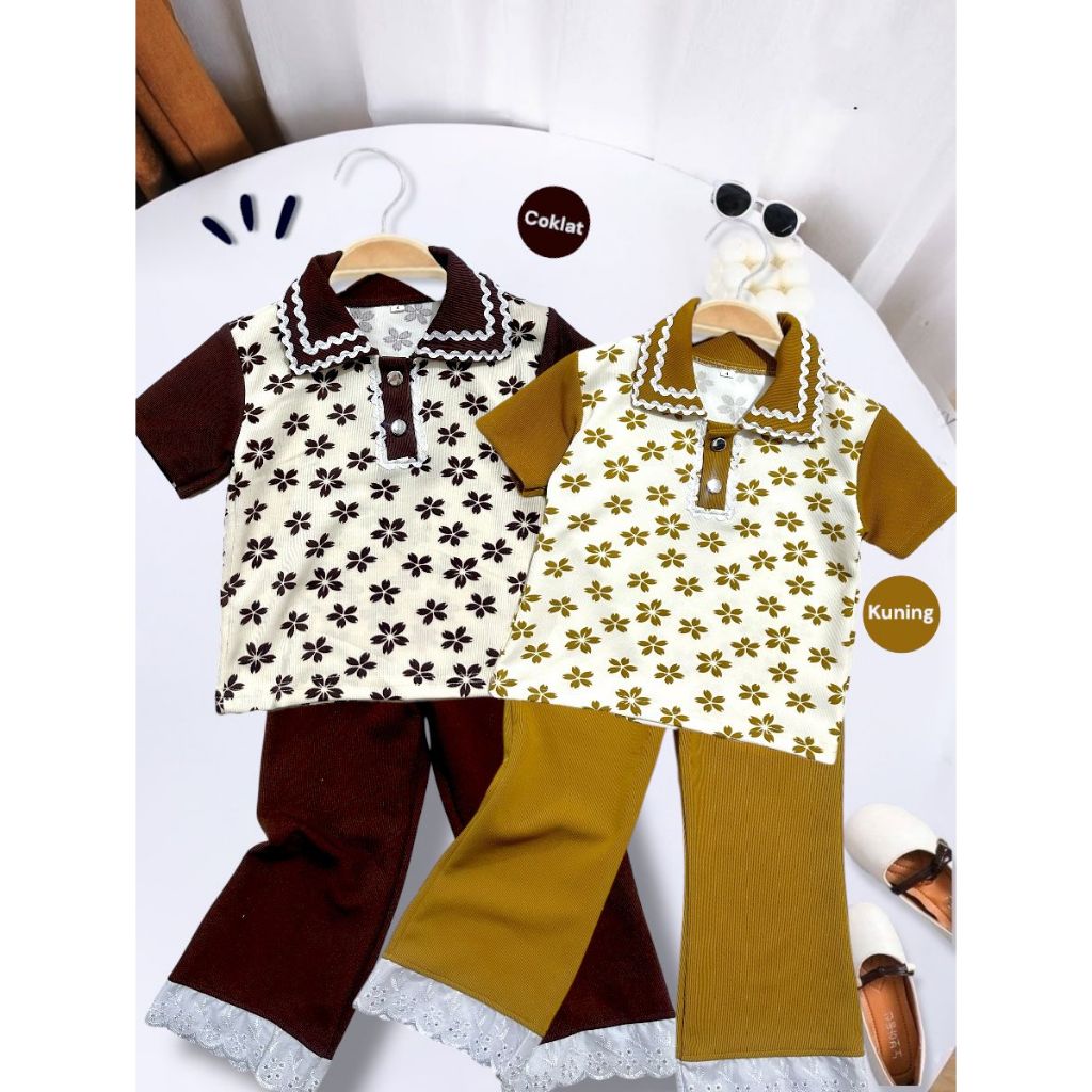 One Set Anak Perempuan Motif Bunga Bahan Knit Japan LInen usia 1 tahun sampai 10 tahun model Baju Kerah