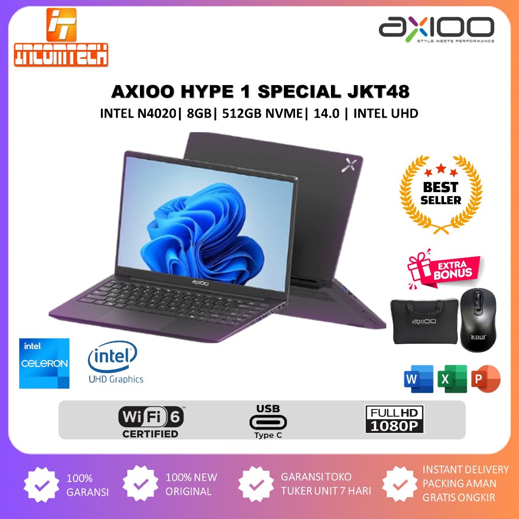 Laptop Axioo Hype 1 Intel N4020 RAM 8GB 128GB + 512GB 14 Inch Windows 11 Pro Garansi Resmi