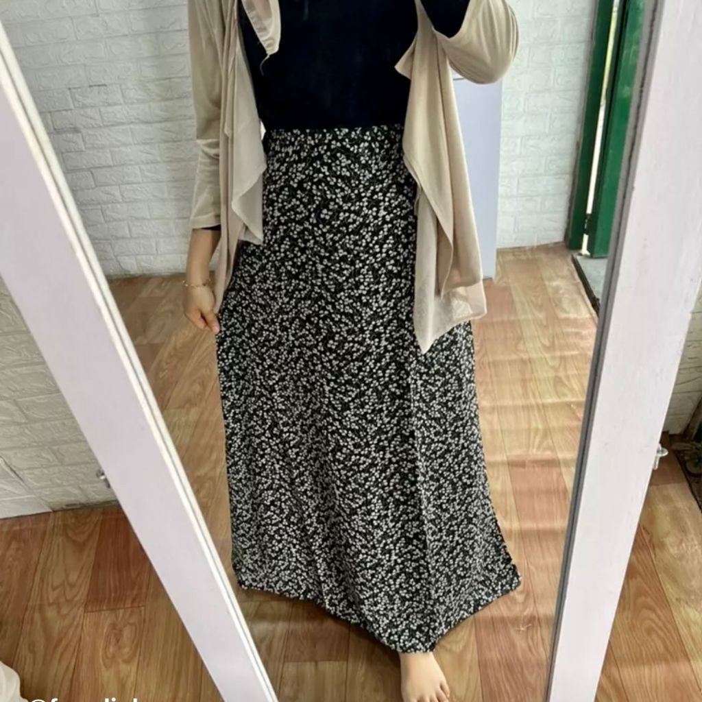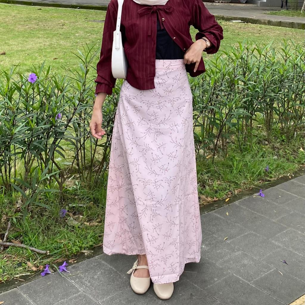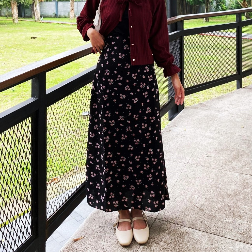 Floral Skirt Pattern Korean Midi Skirt A Line Motif Bunga Sakura Polka