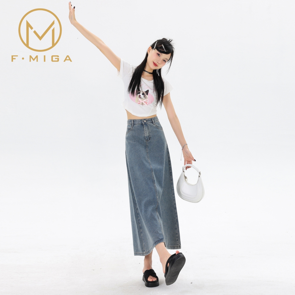 Rok Jeans Midi Wanita F·Miga C46 High Waist Denim Rok Casual Formal Wanita