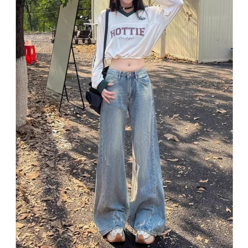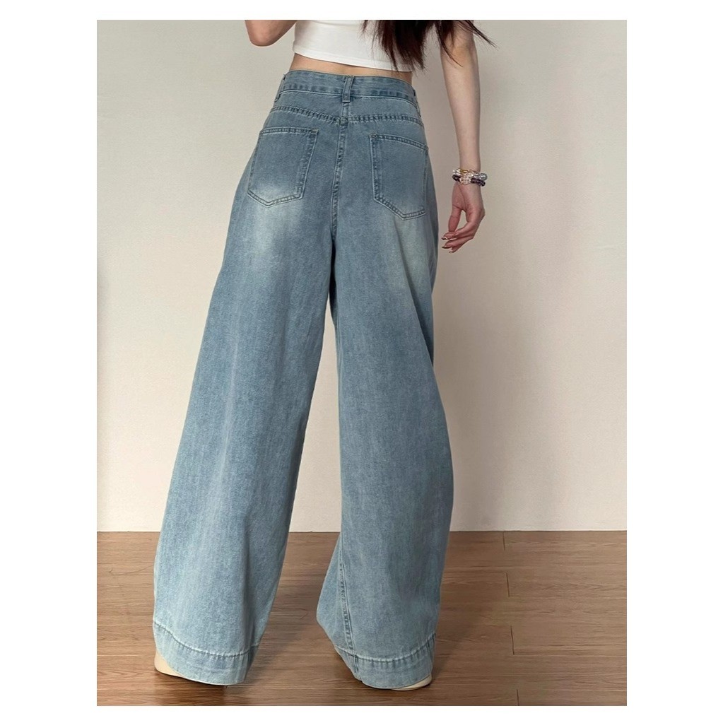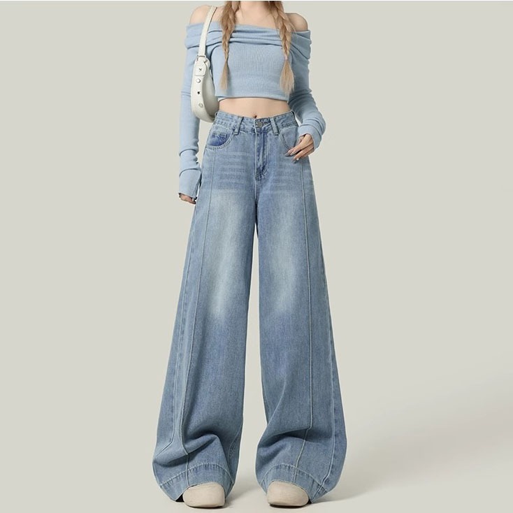 YOYO- New Biru Kekinian Highwaist Kulot Loose Celana Wide Leg Jeans Wanita Korea Style