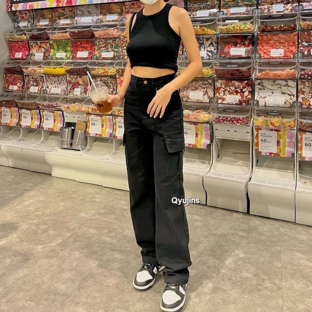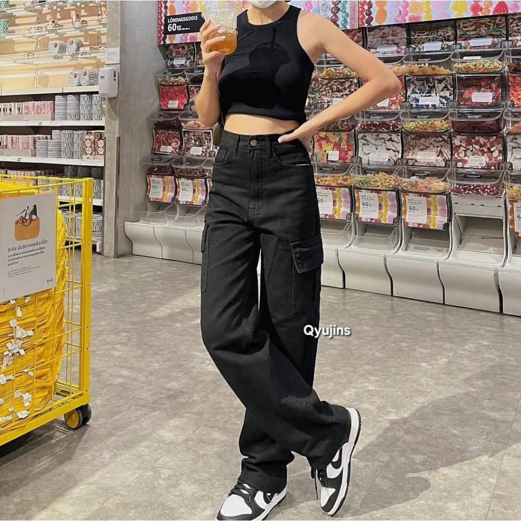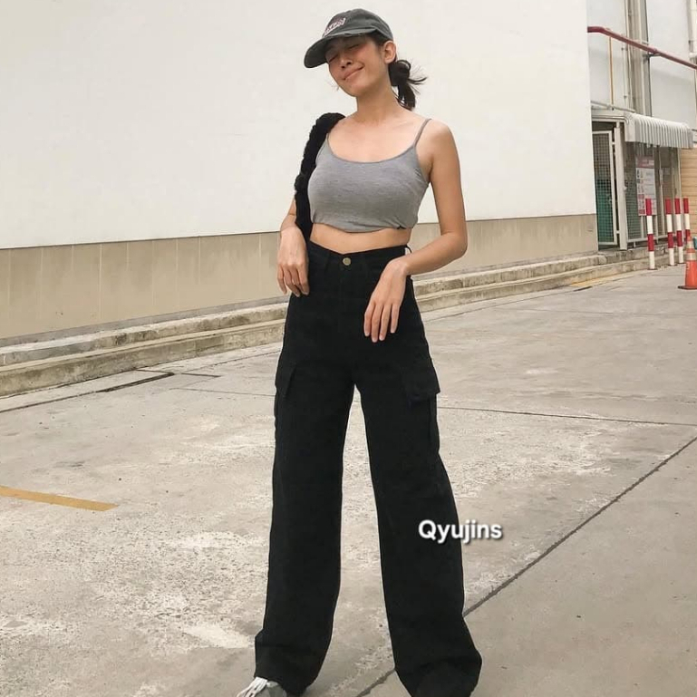 Qyujins - Highwaist Cargo Denim Hitam High Loose HW Baggy Celana Jeans Wanita Panjang Korea Kekinian