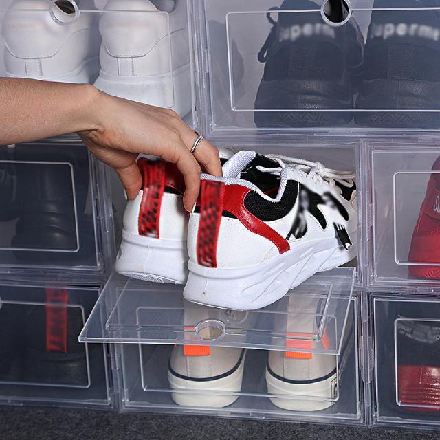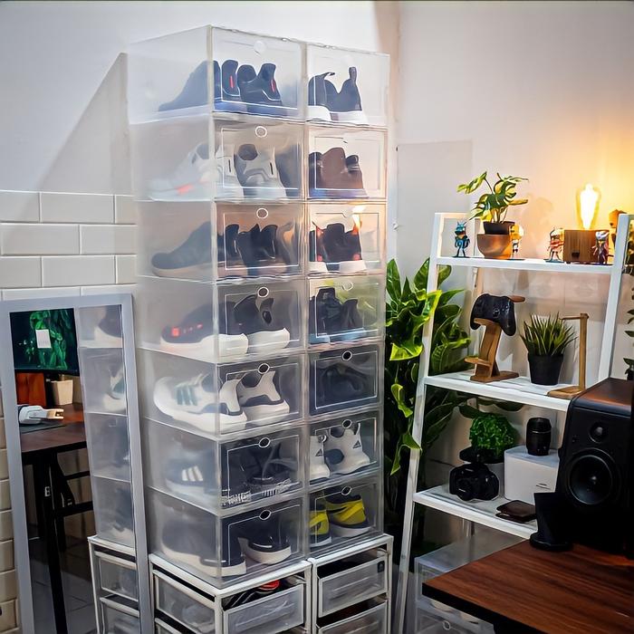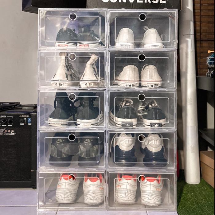 KOTAK SEPATU TRANSPARAN BESAR TEBAL L SHOE BOX SNEAKERS TRANSPARANT DITUMPUK MULTIFUNGSI UKURAN M L XL KUALITAS TERBAIK - L 33X24X14CM