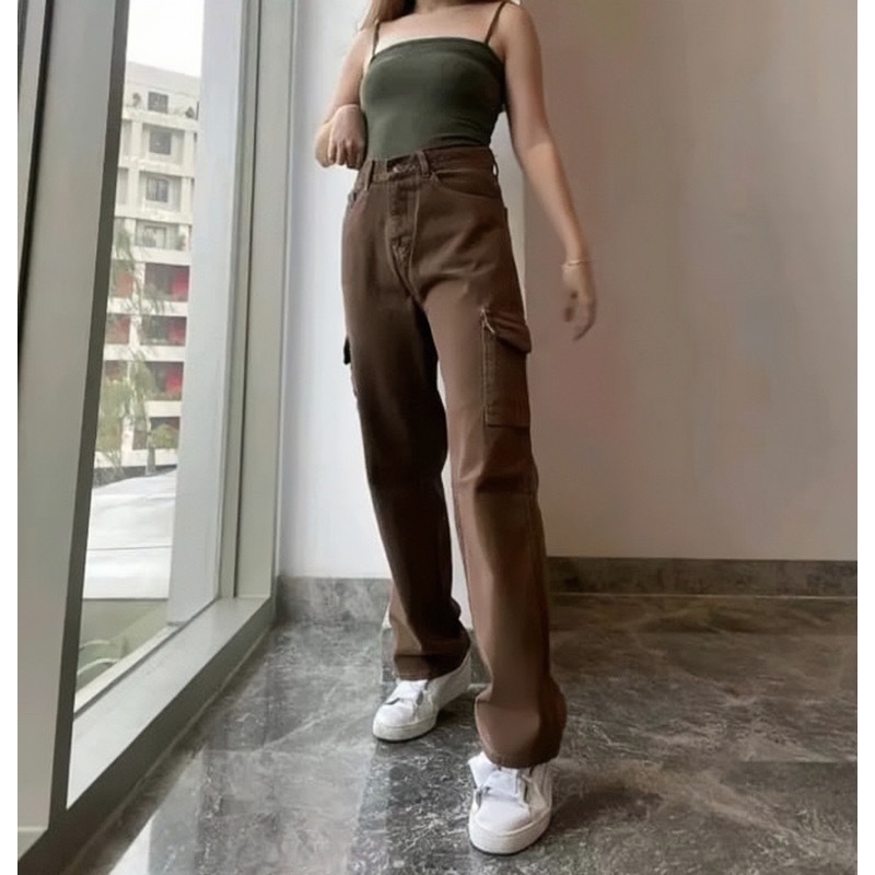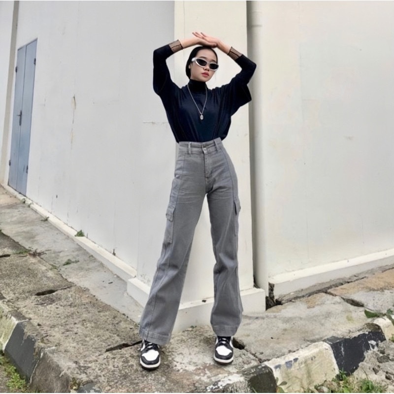 CELANA CARGO JEANS HIGHWAIST WANITA PREMIUM - CELANA CARGO HIGHWAIST LOOSE JEANS CELANA PANJANG KANTONG SAMPING - JECARGO / CARGO CREAM