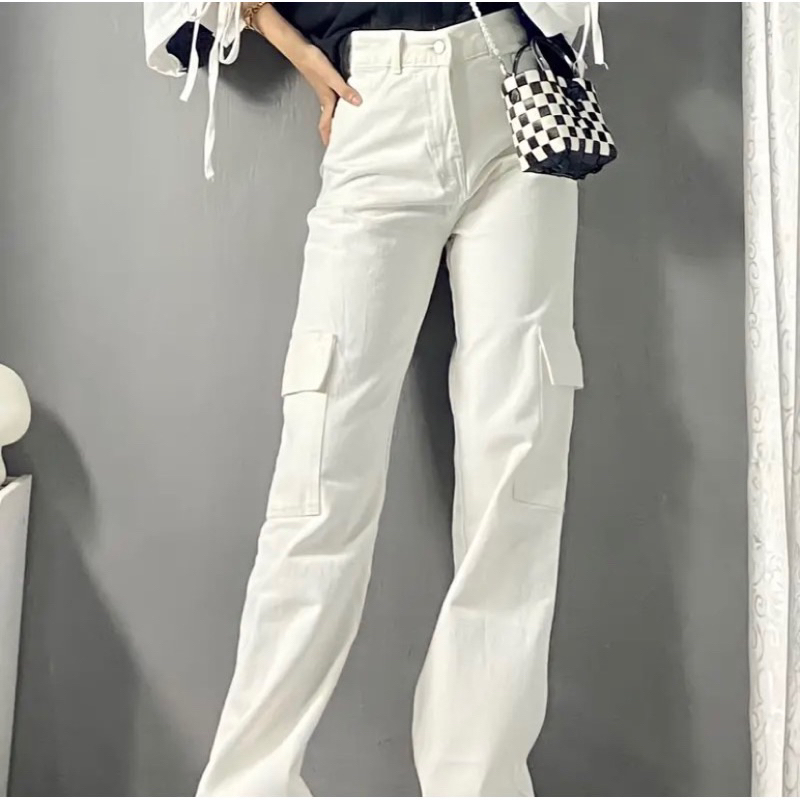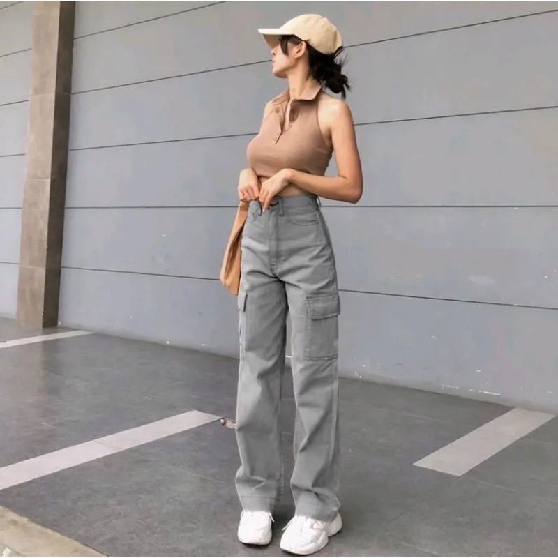 Celana Highwaist Cargo Jeans Wanita Loose Light blue