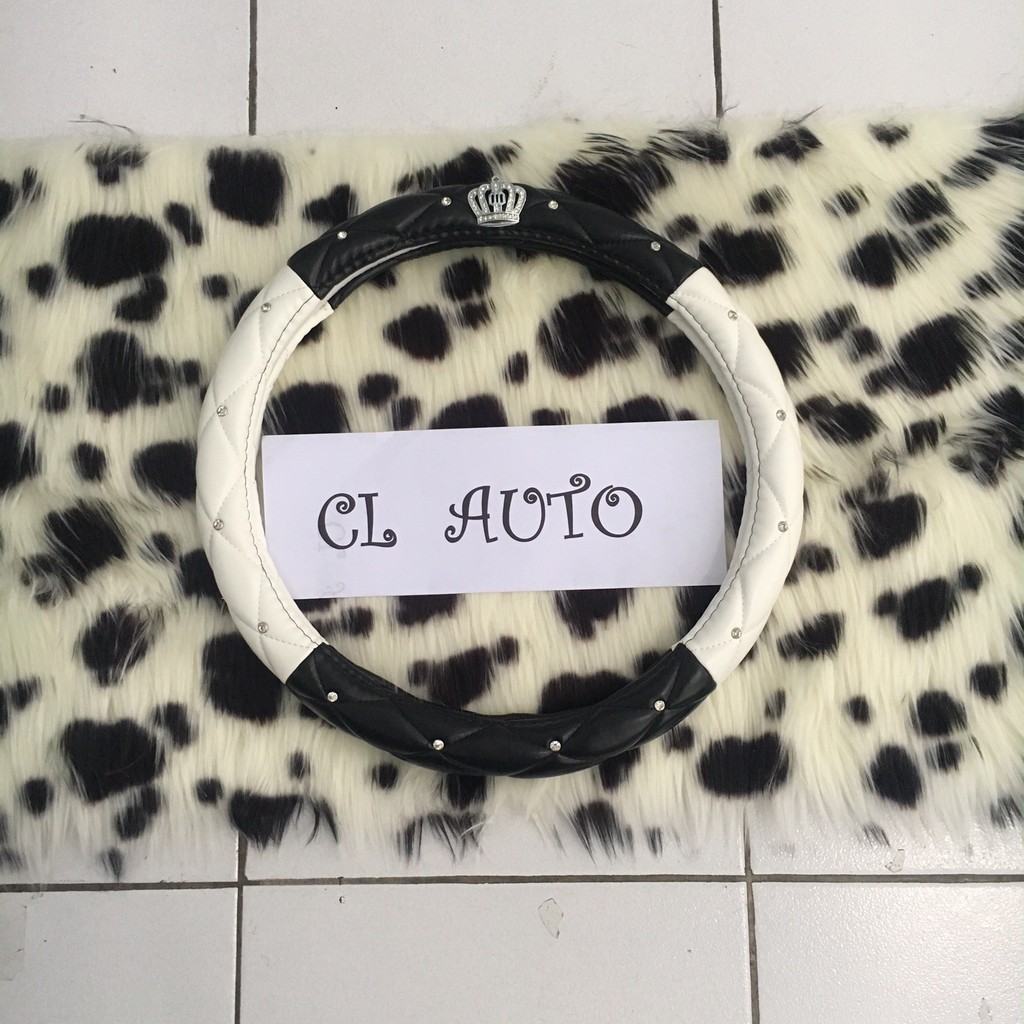 1 Paket Aksesoris Mobil Sarung Stir Mahkota Crown Hitam Putih + Bulu Dashboard Warna Sapi Totol