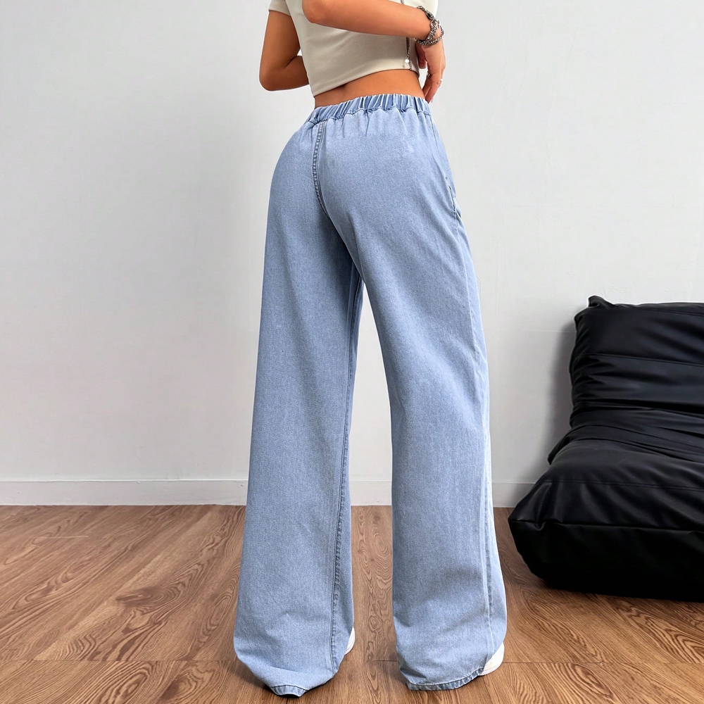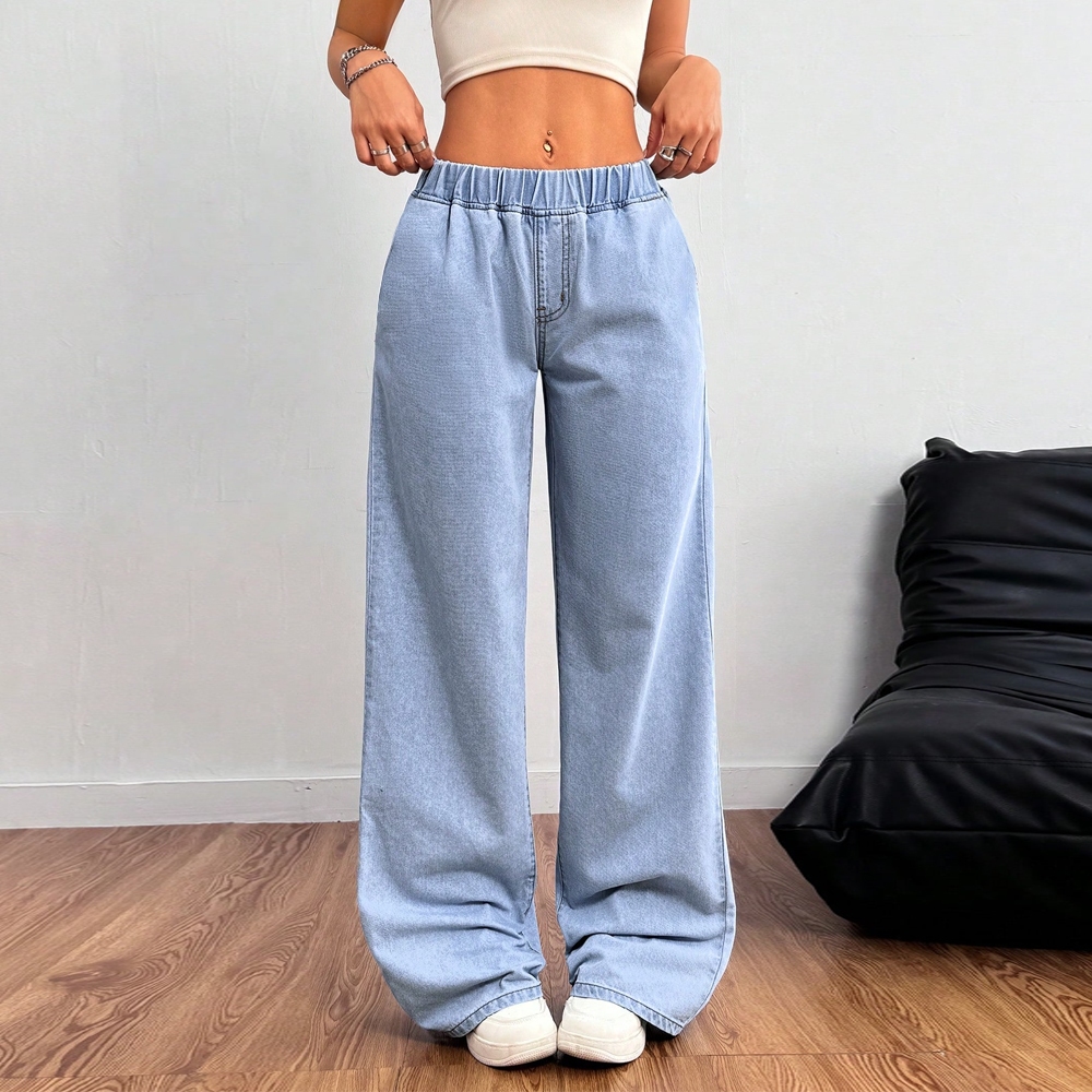 Celana Jeans Wanita Terbaru Elastic Waistband Casual Solid Color Straight Ladies Baggy Denim Pants
