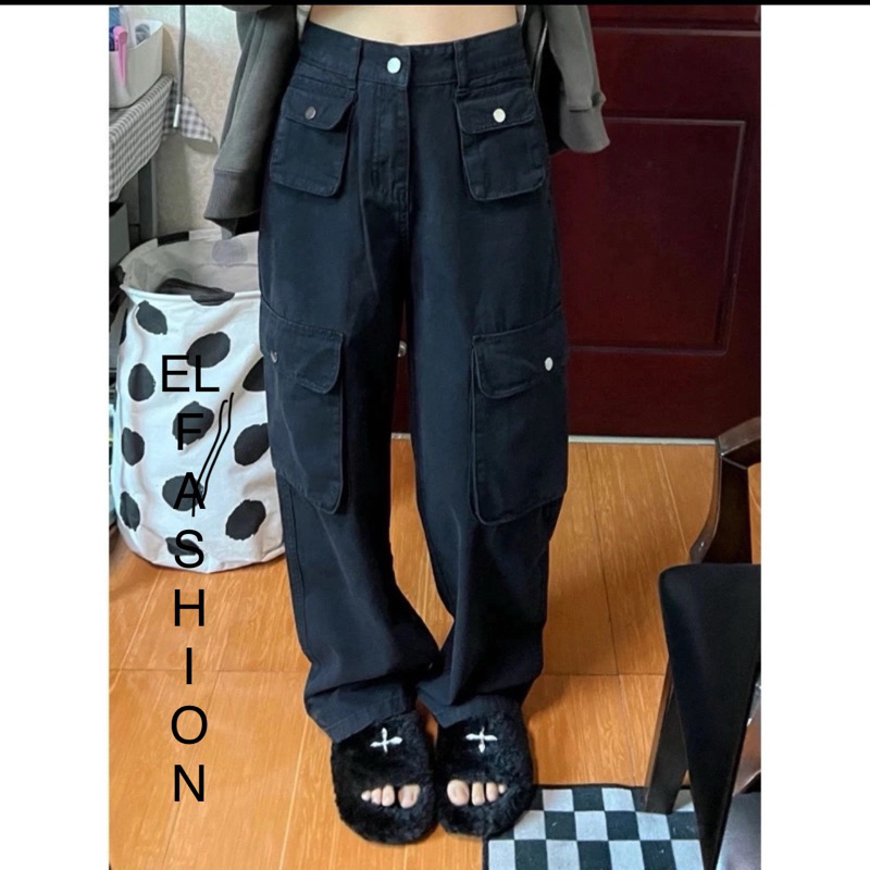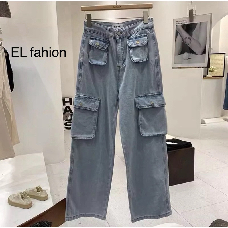 EL FASHION- Cargo Denim Highwaist Loose Celana Jeans Wanita