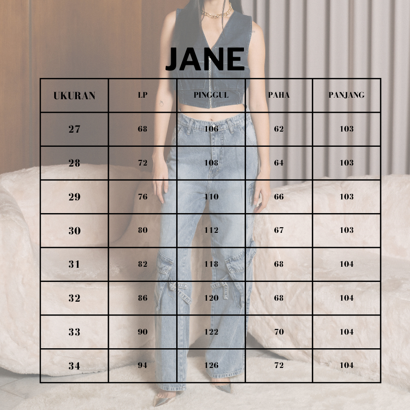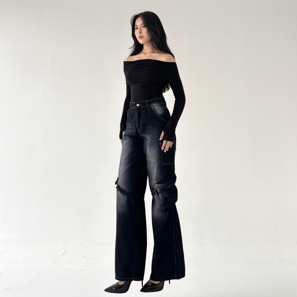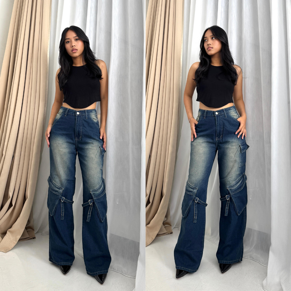 LADOUCE - Jane High Waist Cargo Jeans Celana Panjang Wanita Denim