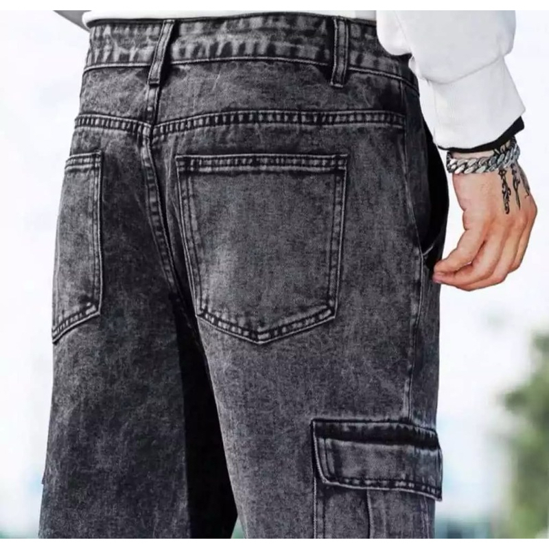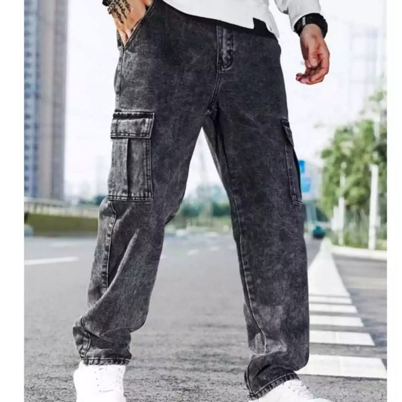 Celana Cargo Panjang Pria Gombrong Korean Style Loose Cargo Pants Blue Jeans Kulot Pants Denim Cowok