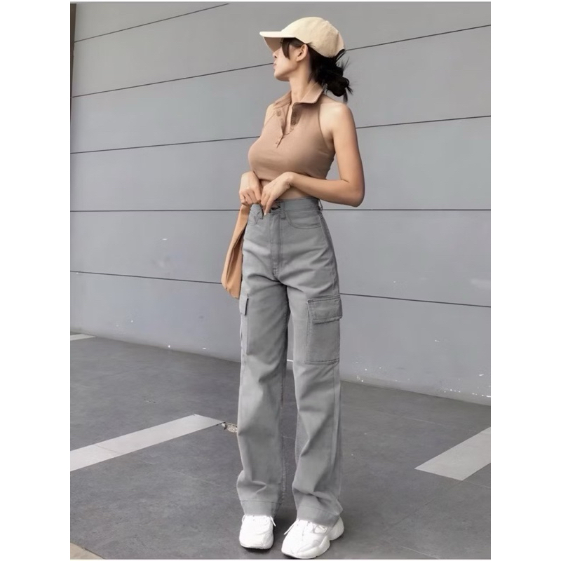 Celana Highwaist Cargo Jeans Wanita Non-Stretch