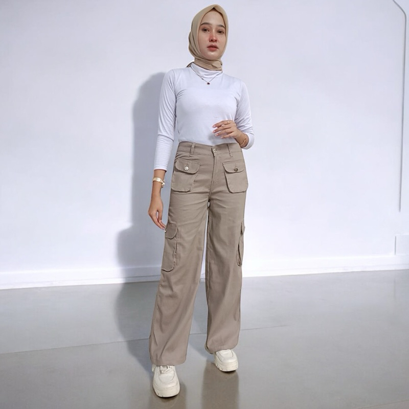 Celana Cargo Panjang Wanita Highwaist - Cargo Denim Pasir Putih Krem Cargo LULU