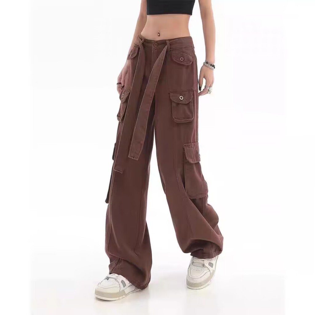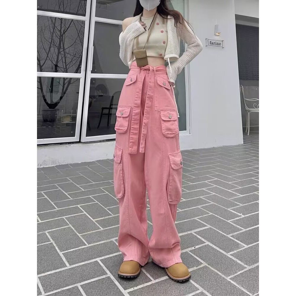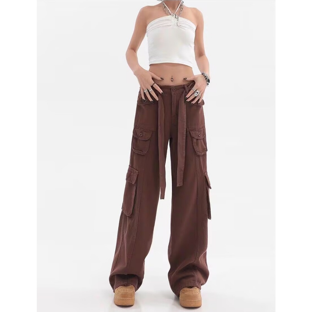 KATERMEN Celana Jeans Wanita Gaya Korea-Pinggang Tinggi Kargo Celana- Longgar Lurus Celana Jeans