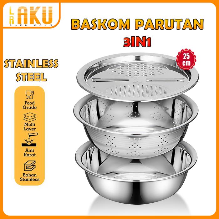 (LR) Baskom Parutan Set 3 In 1 Stainless - Parutan Serbaguna Pengiris Sayuran Buah Baskom