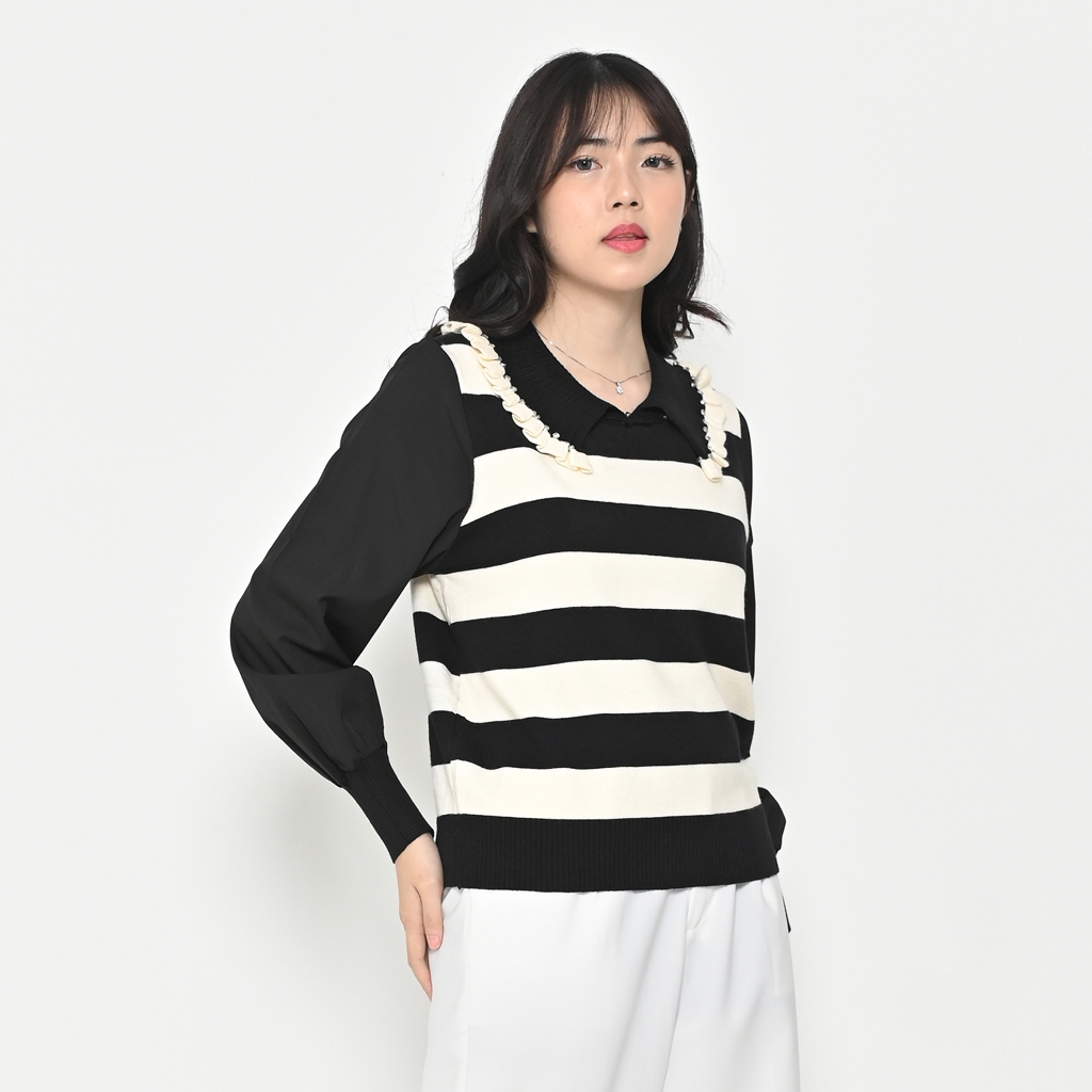 QUEENTIN Sweater Wanita Rajut 6835 Viscose Polyamide Stripe Kombinasi Sifon Lengan Panjang
