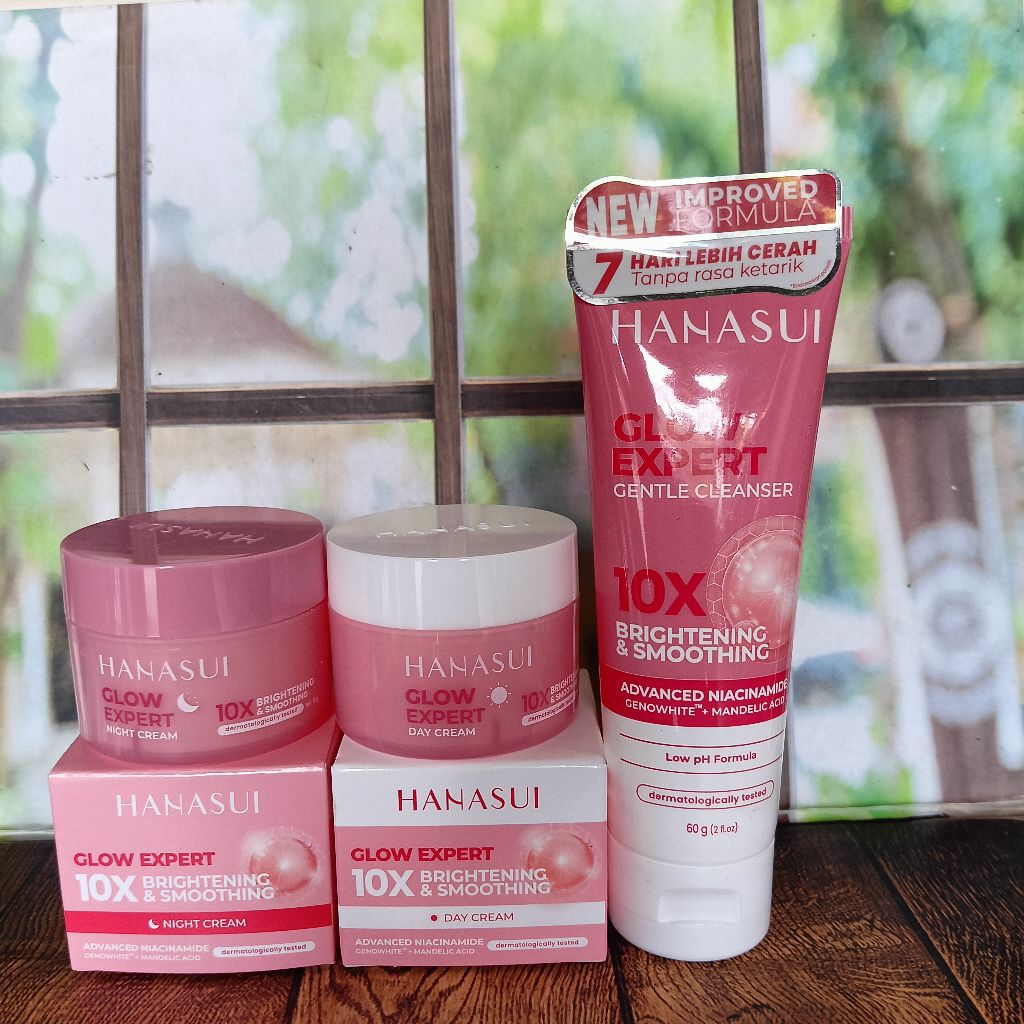 Paket 3in1 Hanasui Glow Expret 10× Brightening & Smoothing Cream Siang malam & Gentle Cleanser 60g Bpom