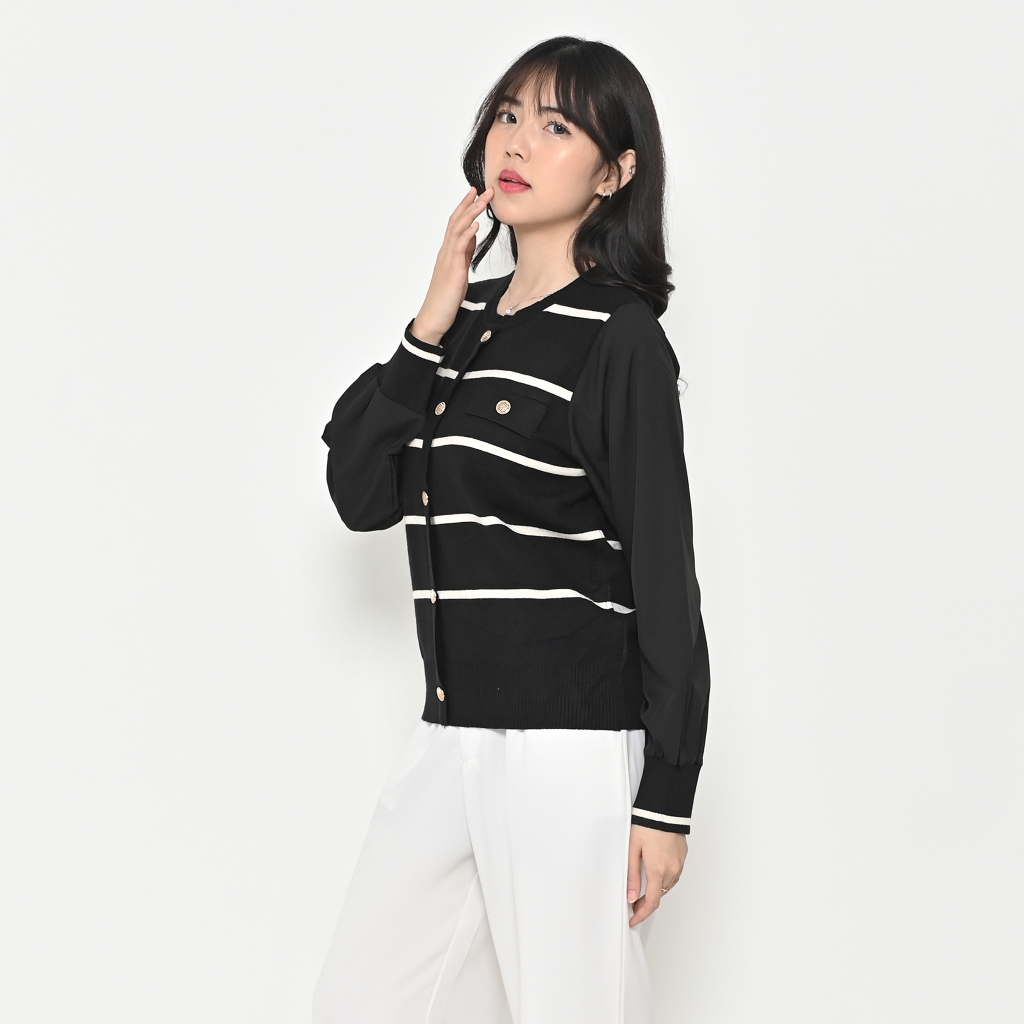 QUEENTIN Sweater Wanita Rajut 7347 Viscose Polyamide Knit Stripe Kombinasi Sifon Lengan Panjang