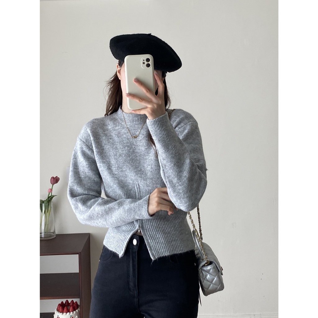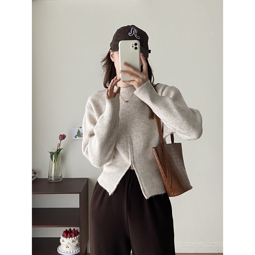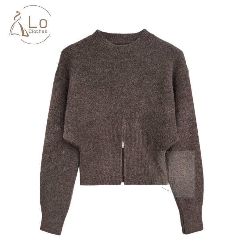 Lo Clothes Niche Pakaian Rajut Serbaguna Sweater Warna Solid Longgar Pakaian Rajut Lengan Panjang Ritsleting Wanita