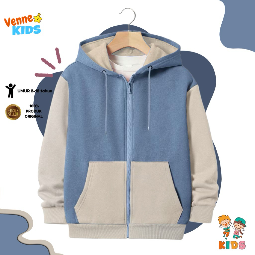 PAKAIAN ANAK KEREN Jaket Zipper Polos Anak Laki-laki Perempuan Usia 2-12Tahun tahun kombinasi bahan Fleece Tebal VENNE