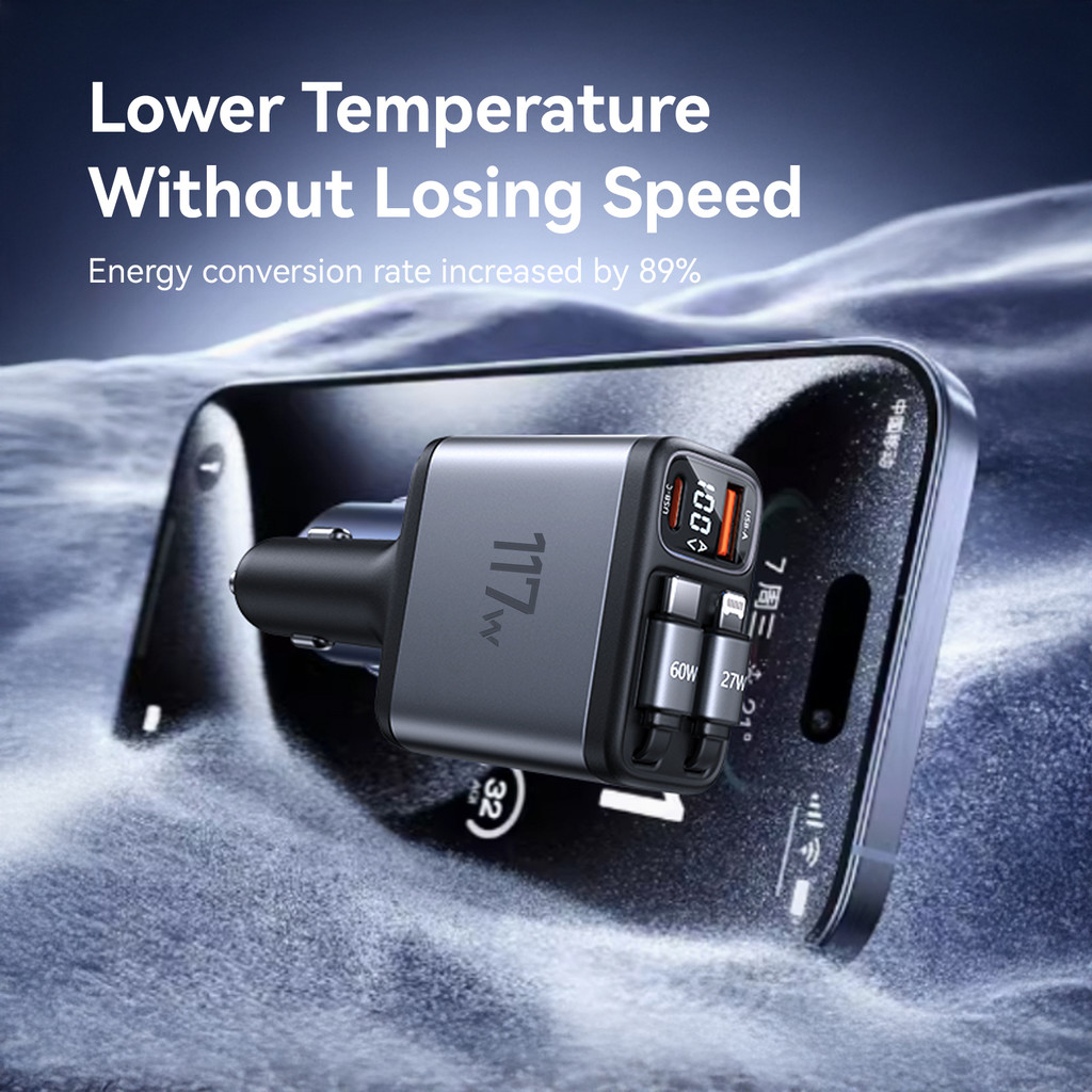KiiP SC18 Car Charger 4 in 1 Super Fast Charging PD 117W Charger Mobil Built-in Rectractable Cable Type-C+Lightning