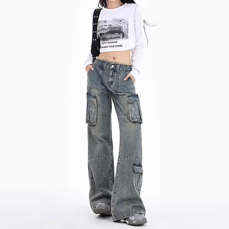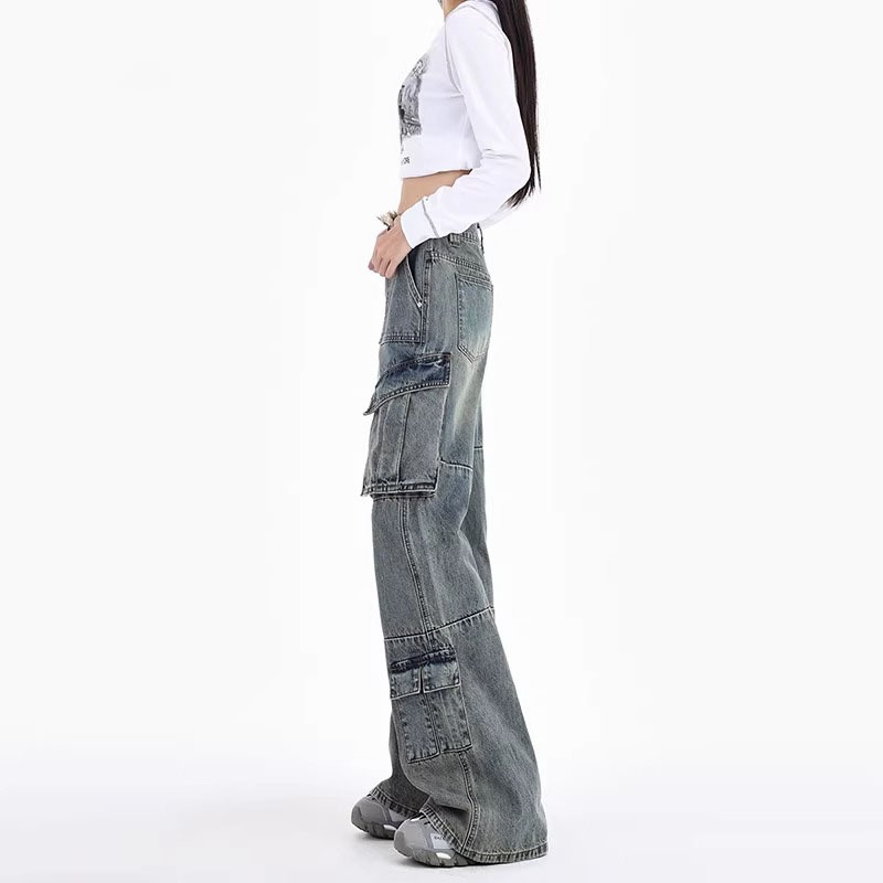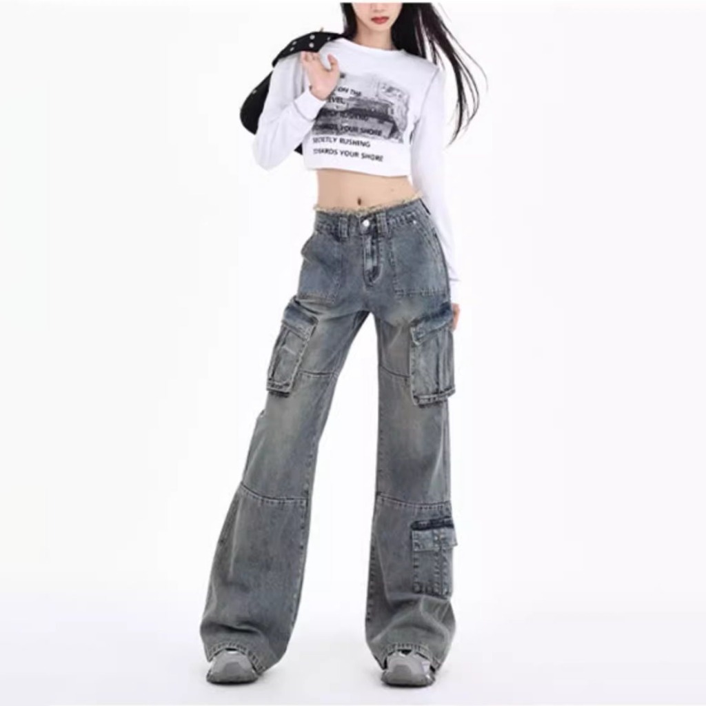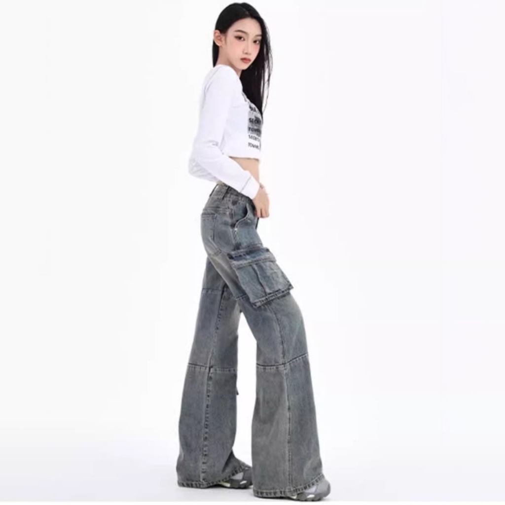 Alice Jeans-Celana Jeans Wanita Loose Cargo Highwaist Fashion Biru Retro