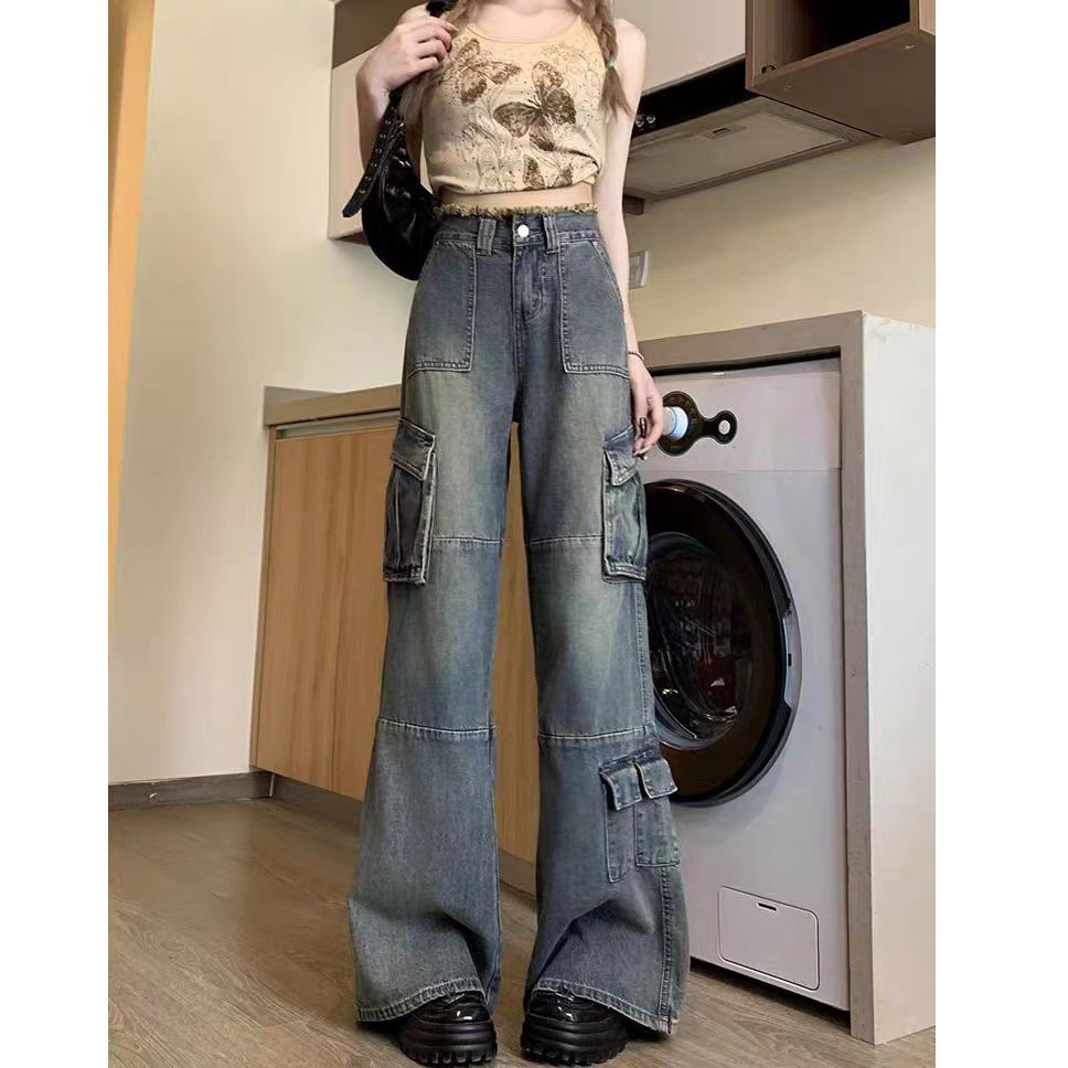 LULU Premium Biru Retro New Highwaist Cargo Celana Jeans Unisex