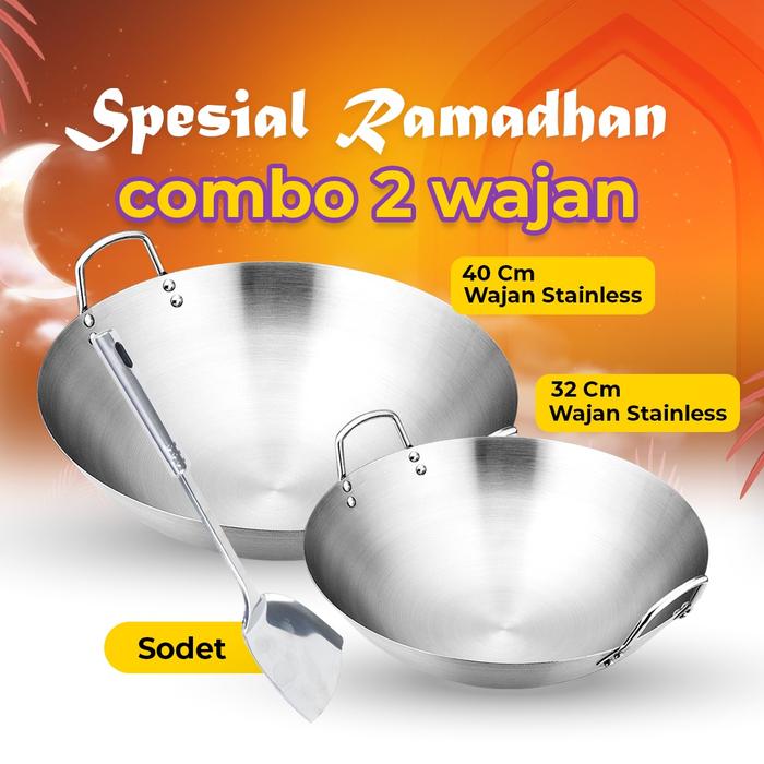 PAKET COMBO 2PCS WAJAN STAINLESS STEEL TEBAL 32CM +40CM FREE SPATULA