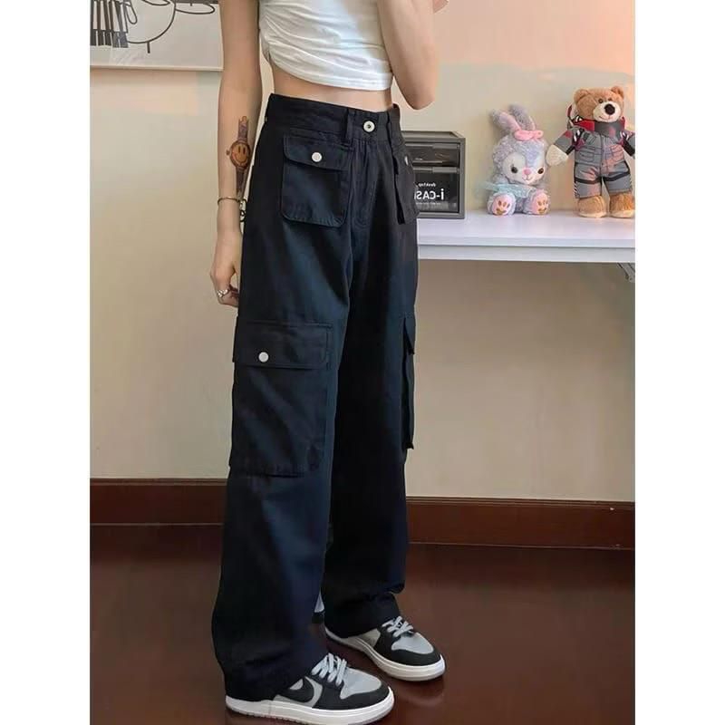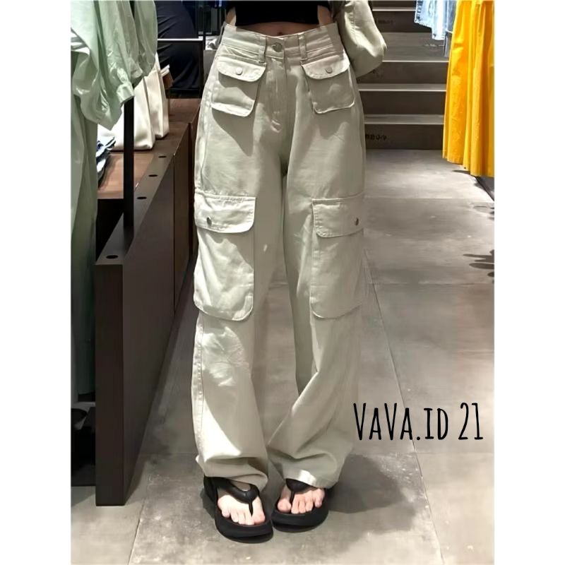 VaVa.id 21-Celana Jeans Cargo Wanita Denim Pasir Putih HighWaist Korean Style