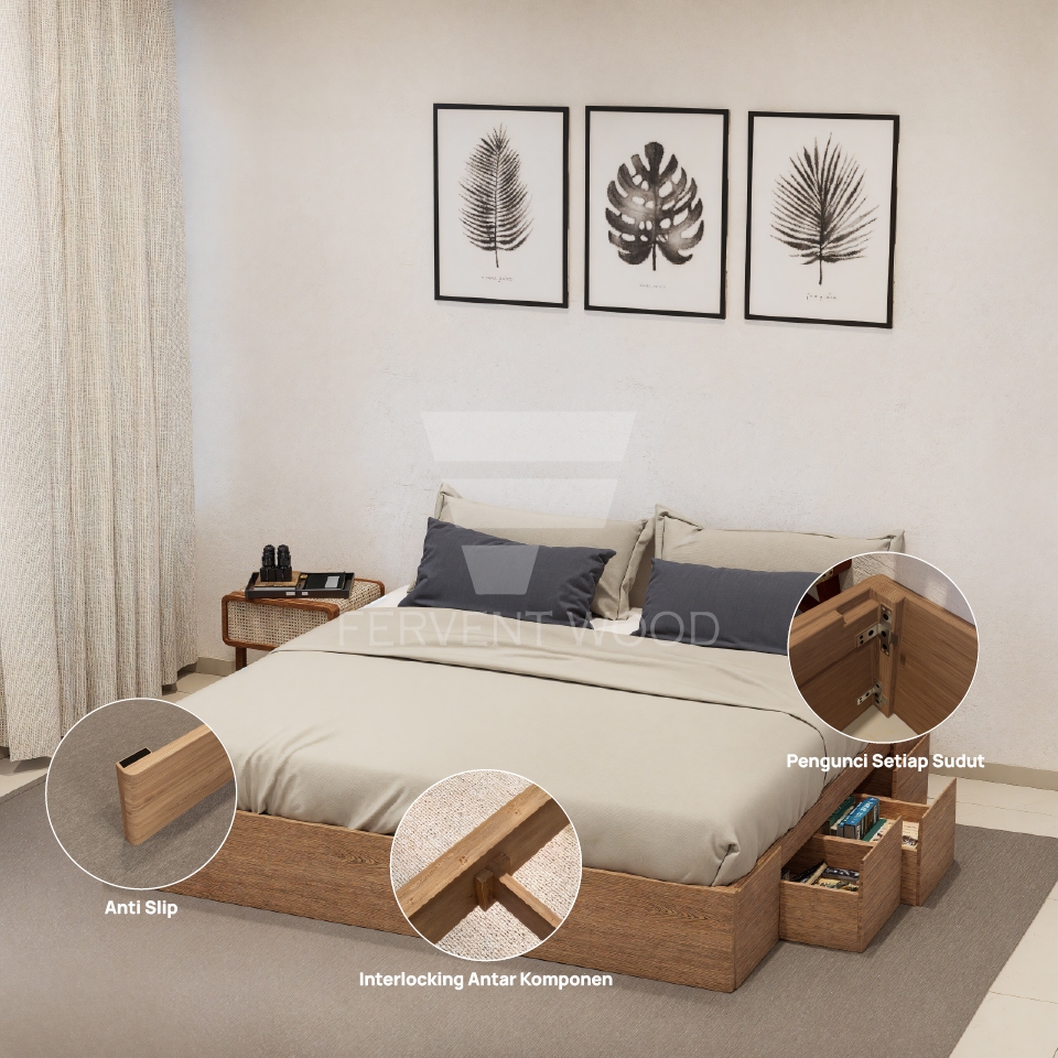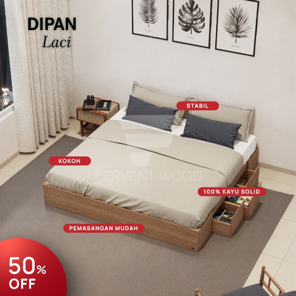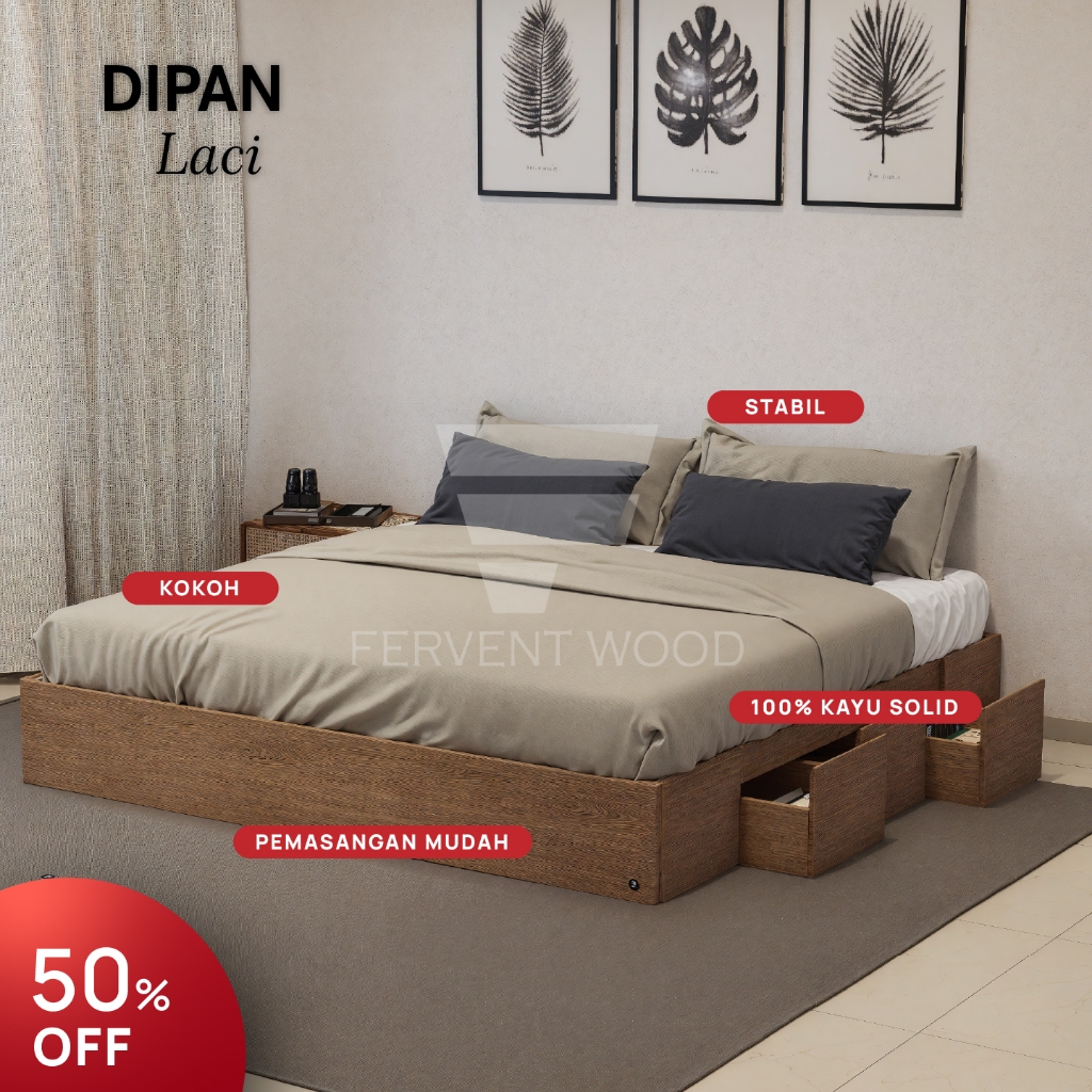 FERVENT WOOD Dipan Laci Tempat Tidur Kasur Divan Kayu Solid Minimalis Pemasangan Mudah Kokoh