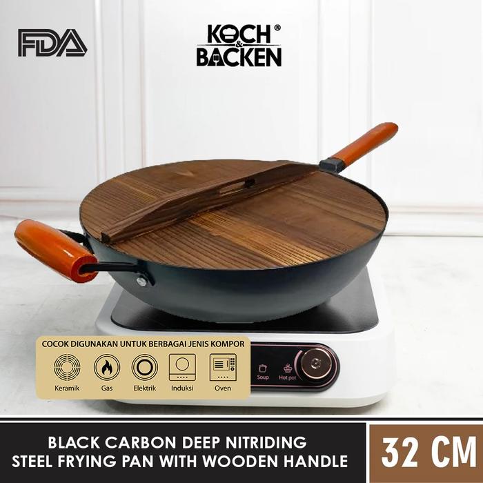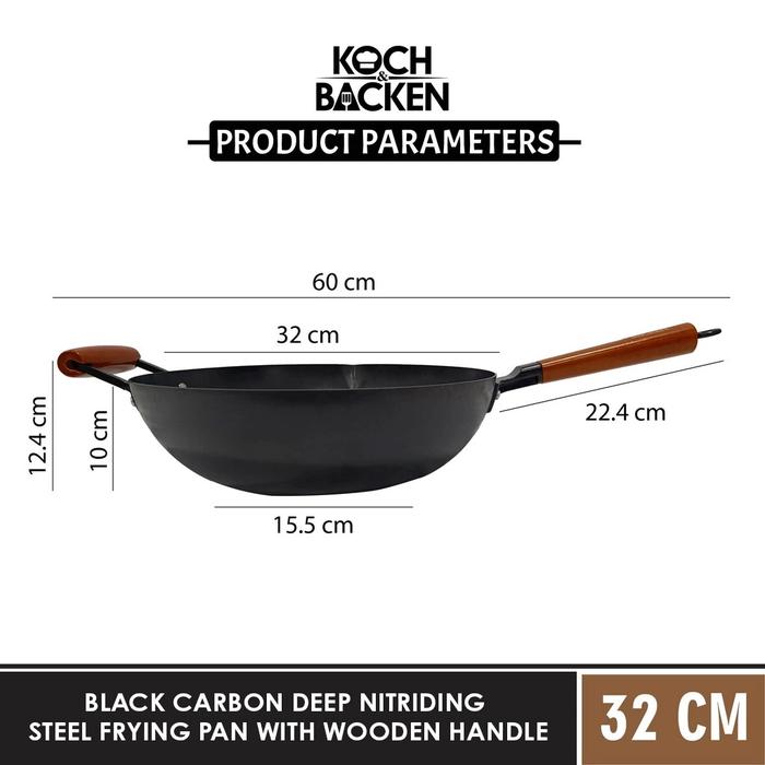 KOCH&BACKEN Black Carbon Steel Wok Deep Nitriding 32cm - Wajan Kuali Penggorengan Panci Anti Lengket - Wok Uk 32cm
