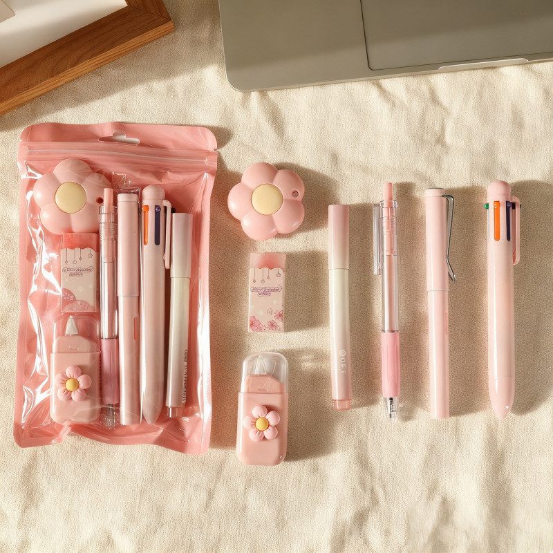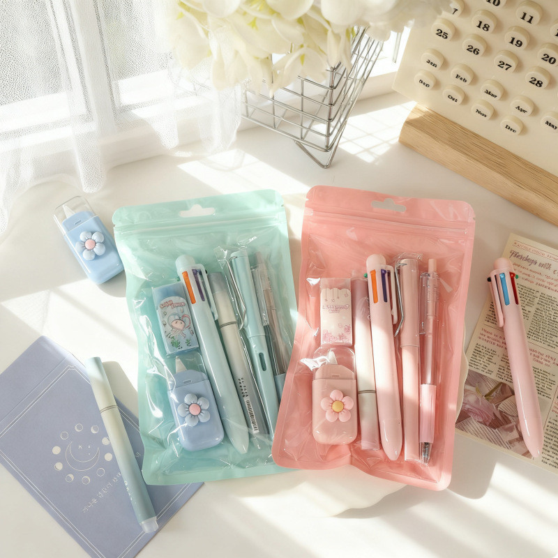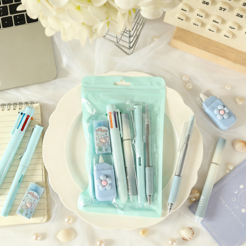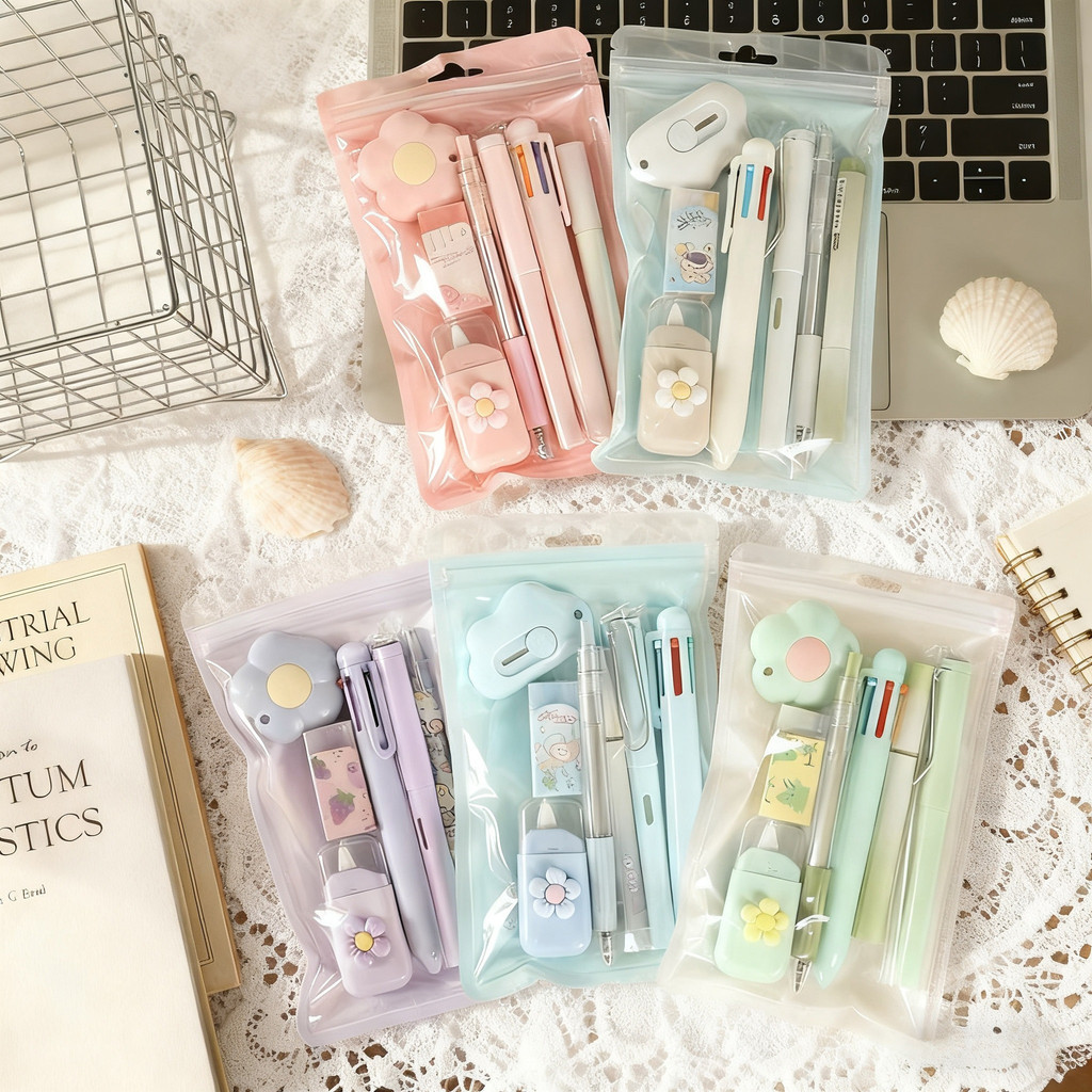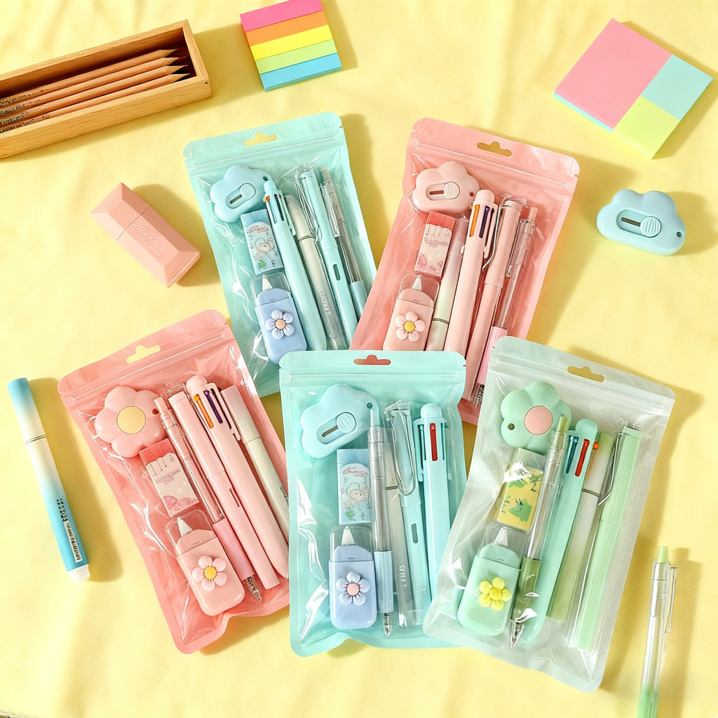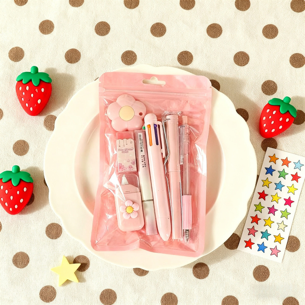 Paket Perlengkapan Tulis 7 IN 1 - Termasuk Pulpen, Pensil, Penghapus, dan Cutter Lucu