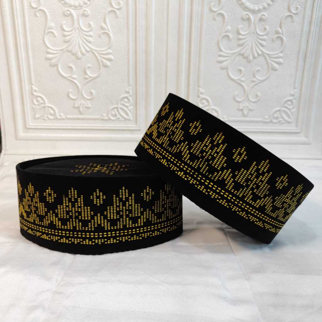 Peci Songkok Kopiah Hitam Motif Songket Batik Warna Gold Tinggi 9Cm Peci Anak Muda Santri