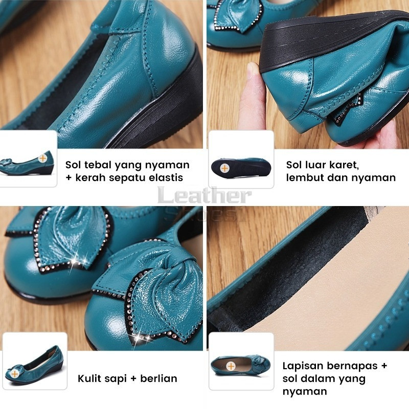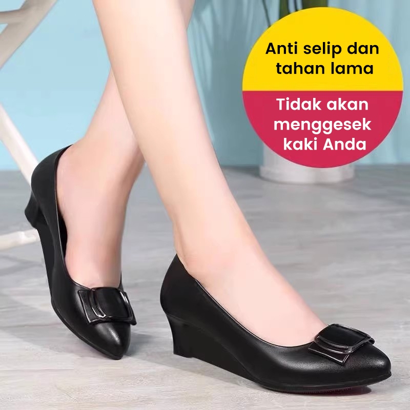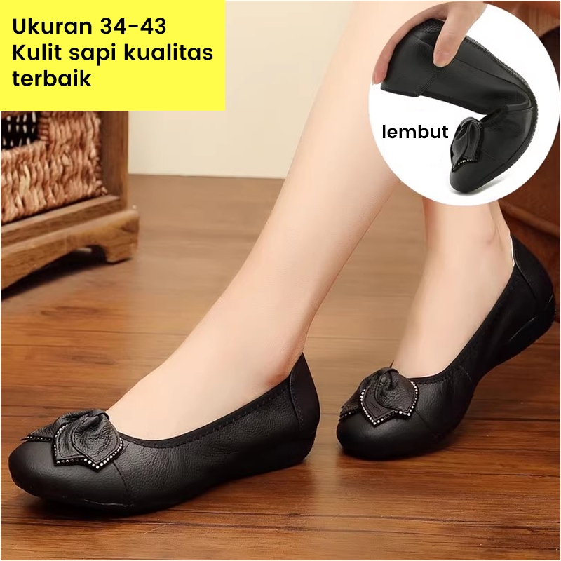 Sepatu Wedges Wanita Sepatu Kerja Flat Kasual Kulit Sapi Hitam Slip on Wanita Dewasa