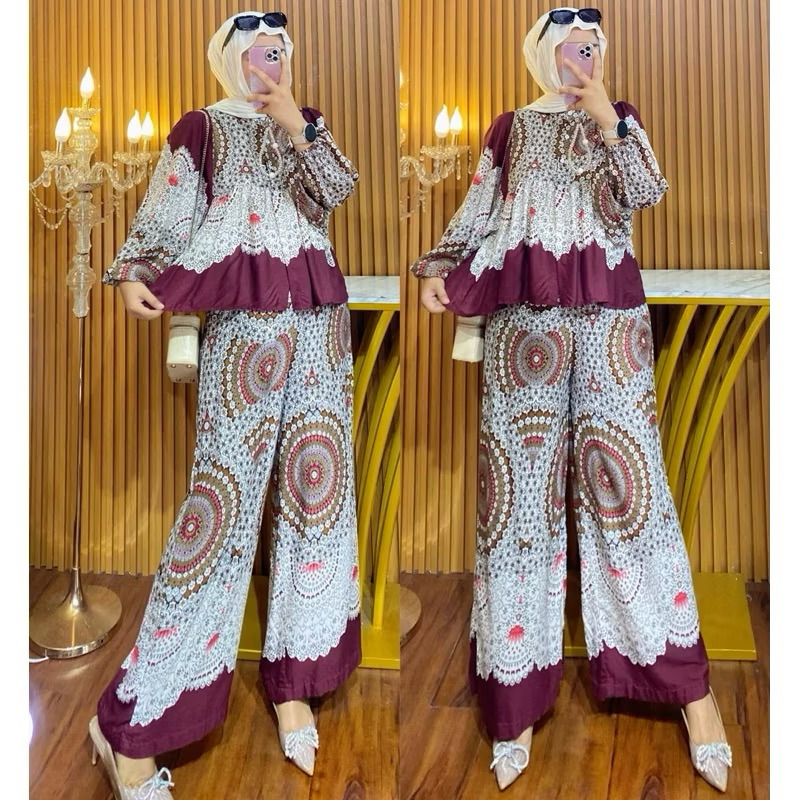 Maura Set / Setelan Celana Kulot Lengan Balon Viral / OneSet Rayon Motif Terbaru / Setelan Jumbo Lengan Balon