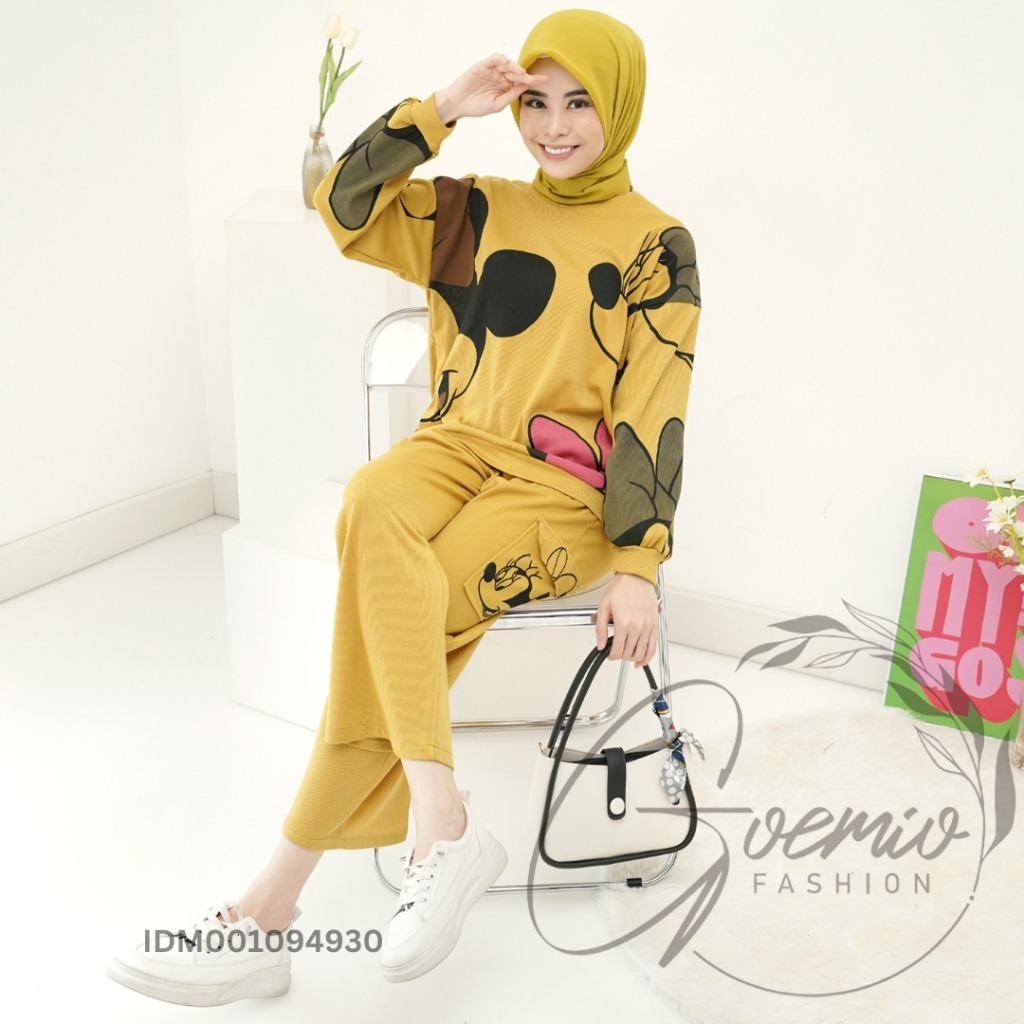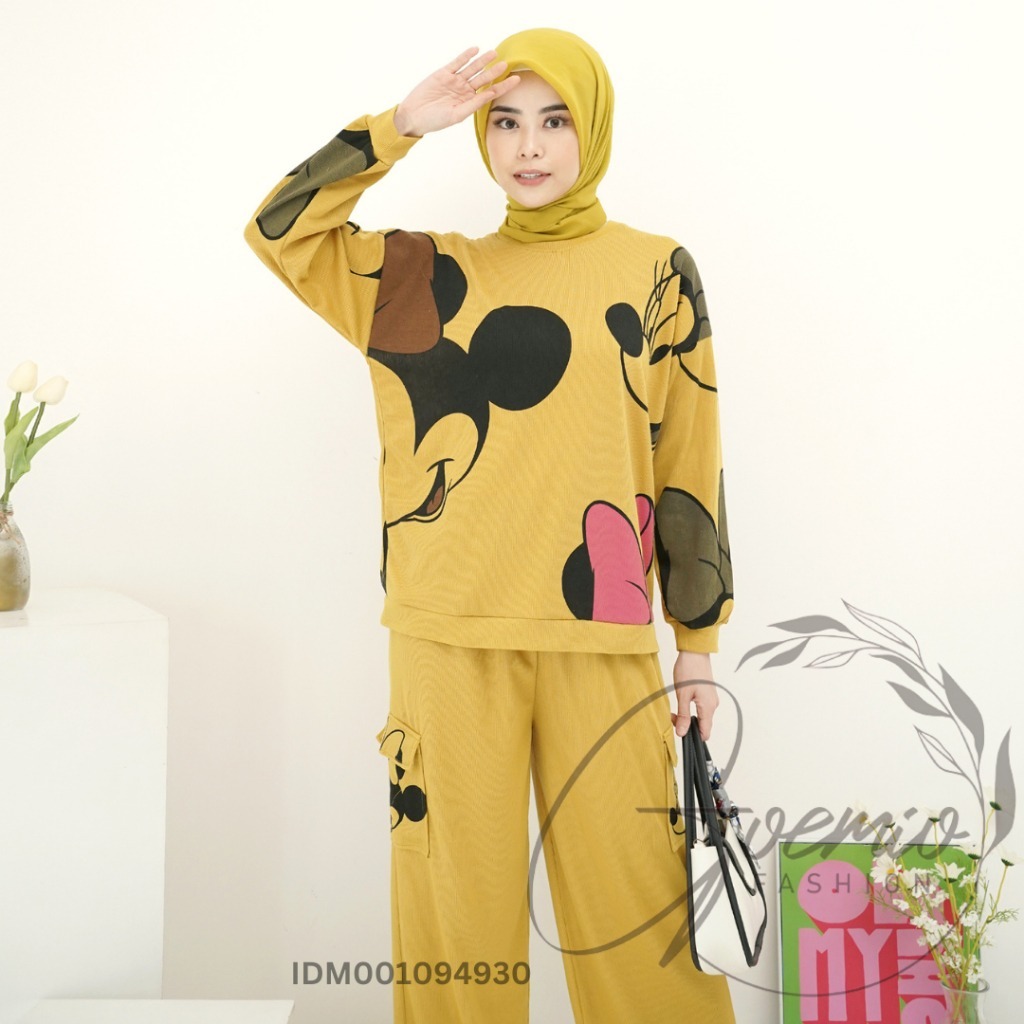 Pre Order ICE | LD 112 One Set Queen Setelan Katun Knit Combi Atasan Motif Mickey Mouse Dan Celana Panjang Wanita Motif Lengan panjang
