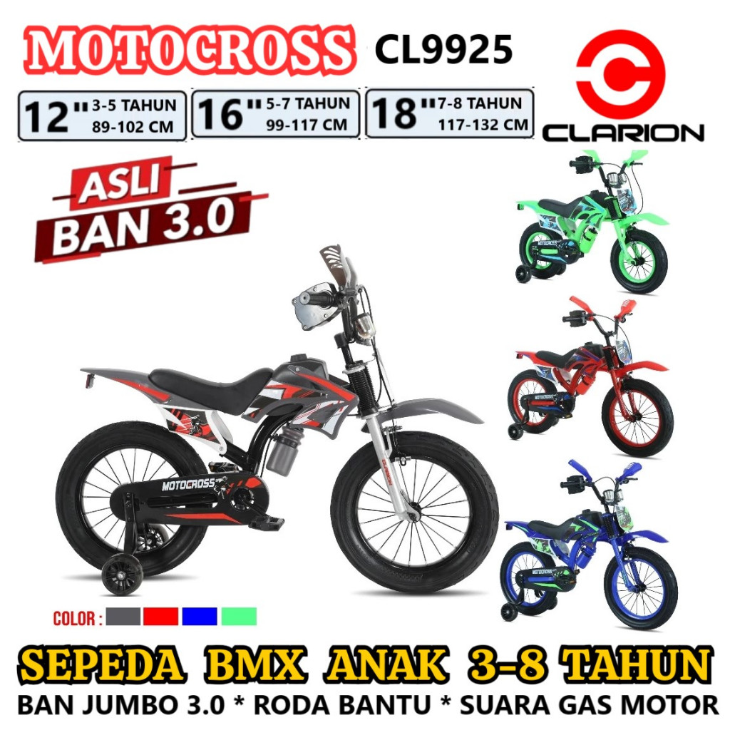 Sepeda BMX Clarion CL9925 12 16 18 Inci Anak 3-8 Tahun Roda Bantu Efek Suara Gas Motocross