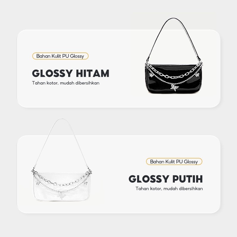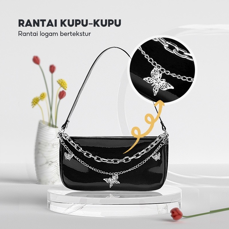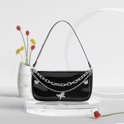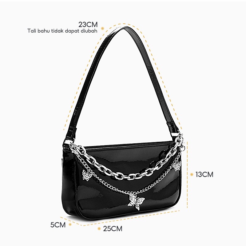 Tas Bahu Wanita Ohsome Dunns Kulit Hitam Glossy Black Leather Shoulder Bag Butterfly Chain