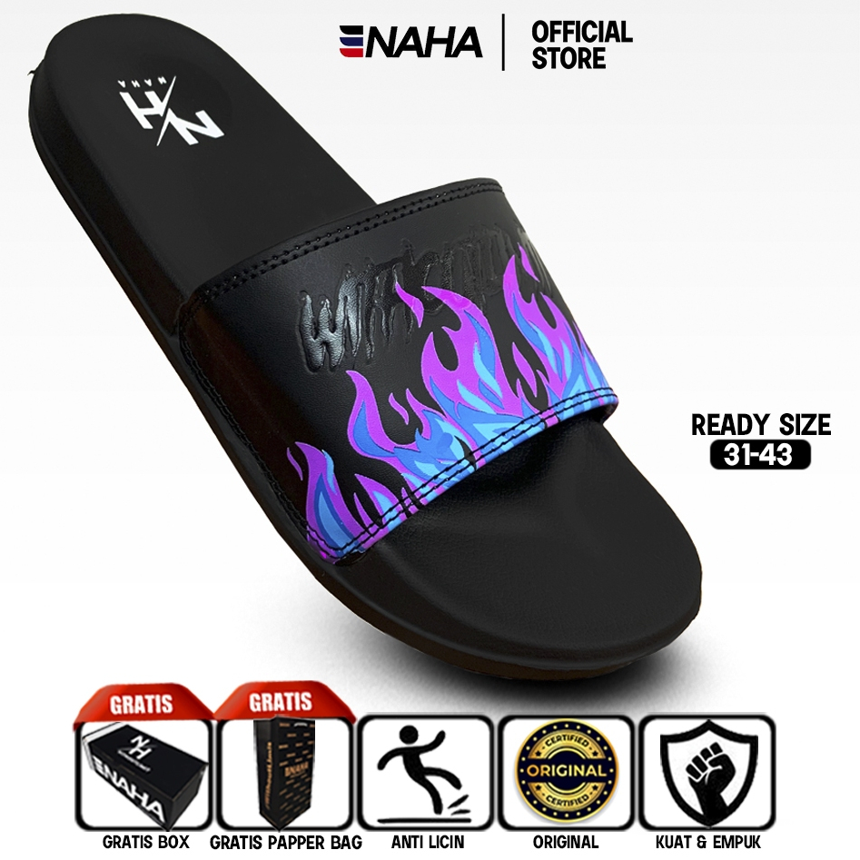 Sandal Slop Pria Wanita Naha Sandal Distro Karet Api Ungu Hitam Size 31 - 43