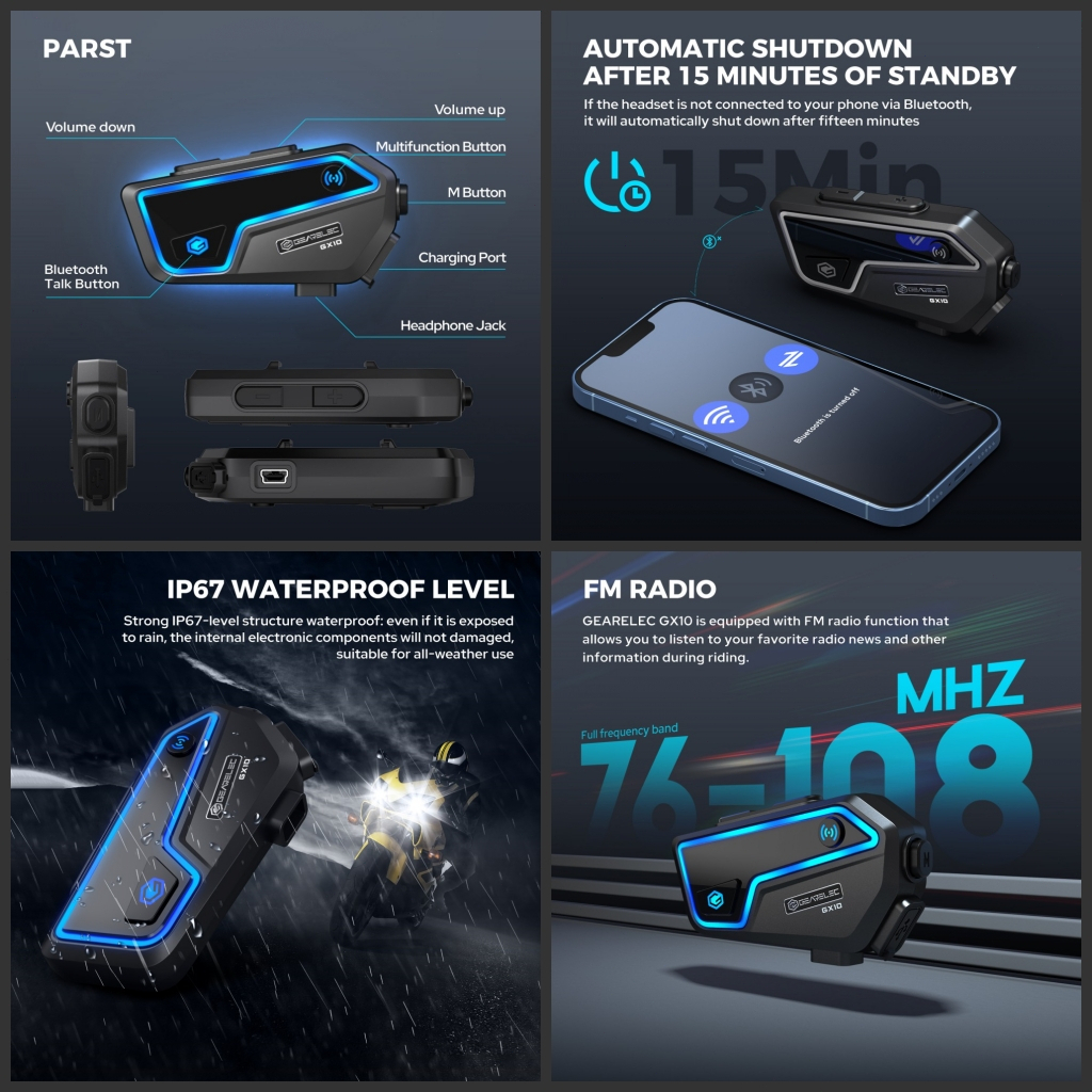 Gearelec Gx10 Bluetooth 5.2 Helm Sepeda Motor Interkom Hingga 10 Pengendara Ip67 Tahan Air Bisa Berbagi Musik Dengan Fm