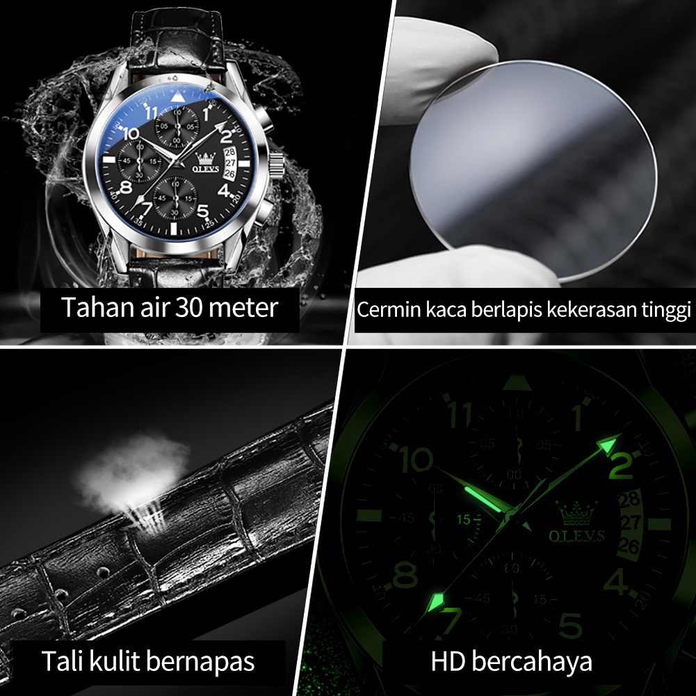 Jam Tangan Pria Anti Air Olevs Original Ahan Kulit Keren Led Multifungsi Chronograph Watch Men 2878