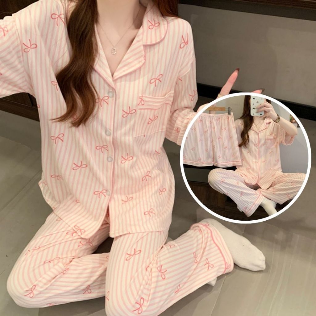 Mirey Sleepwear 3in1 Piyama Wanita Motif Pita Set Celana Panjang Pendek Bahan Adem Lembut