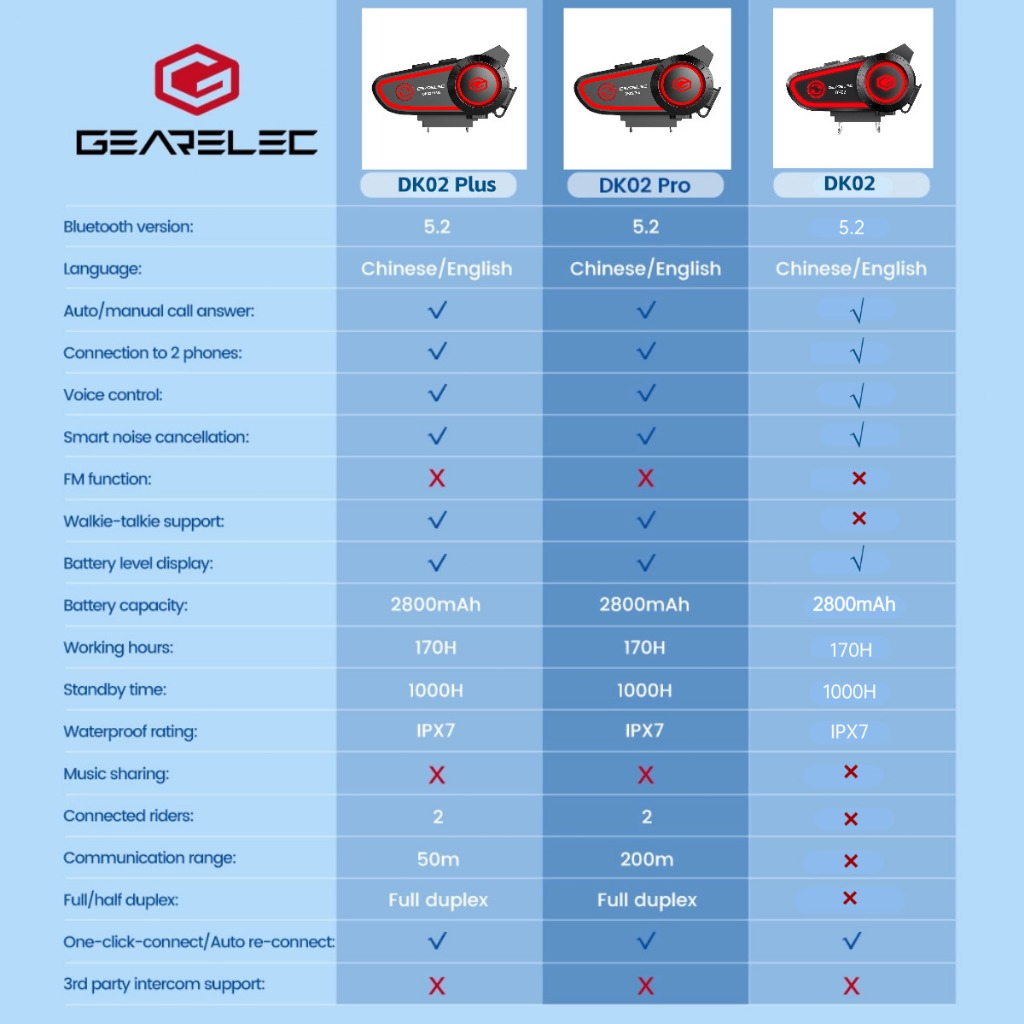 Gearelec Dk02 Intercom Helm Bluetooth Headset Bt5.2 Ipx7 Tahanair 50-200M 2 Riders Connected 2800Mah