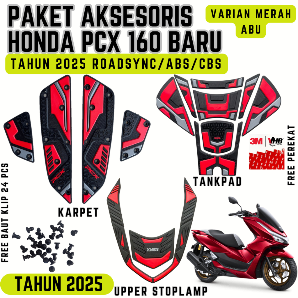 PAKET FULLSET AKSESORIS PCX 160 TAHUN 2025 ROADSYNC/ABS/CBS KARPET/TANKPAD/UPPER STOPLAMP