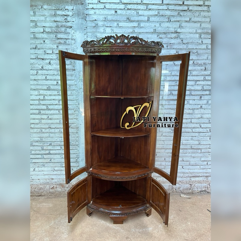 Lemari hias sudut jati / lemari pojok / lemari piala TERMURAH READY STOK LANGSUNG DARI PENGRAJIN PERTAMA JEPARA