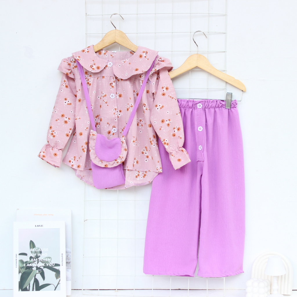 Setelan Anak Perempuan Maura Motif Bunga I Bahan Crinkle Airflow Usia 3-12 Tahun Free Tas