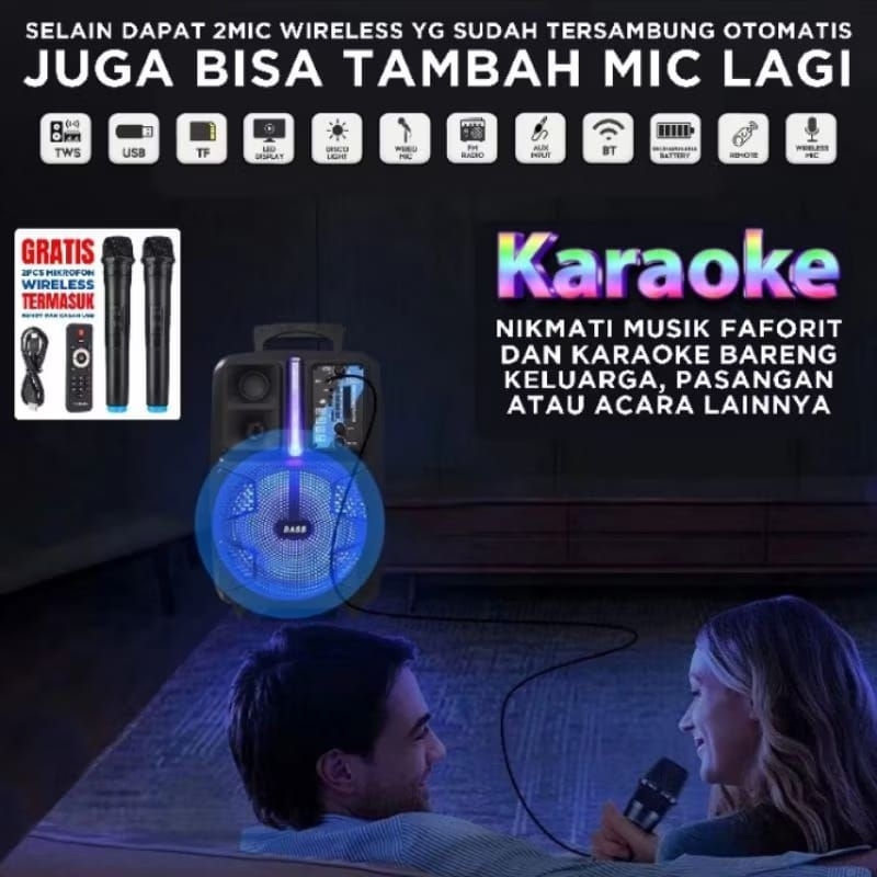 Speaker Bluetooth Fleco X-Bass F-8808Led 8,5 Inchi Free Microphone Wireless Karaoke Remote Control Salon Aktif Portable