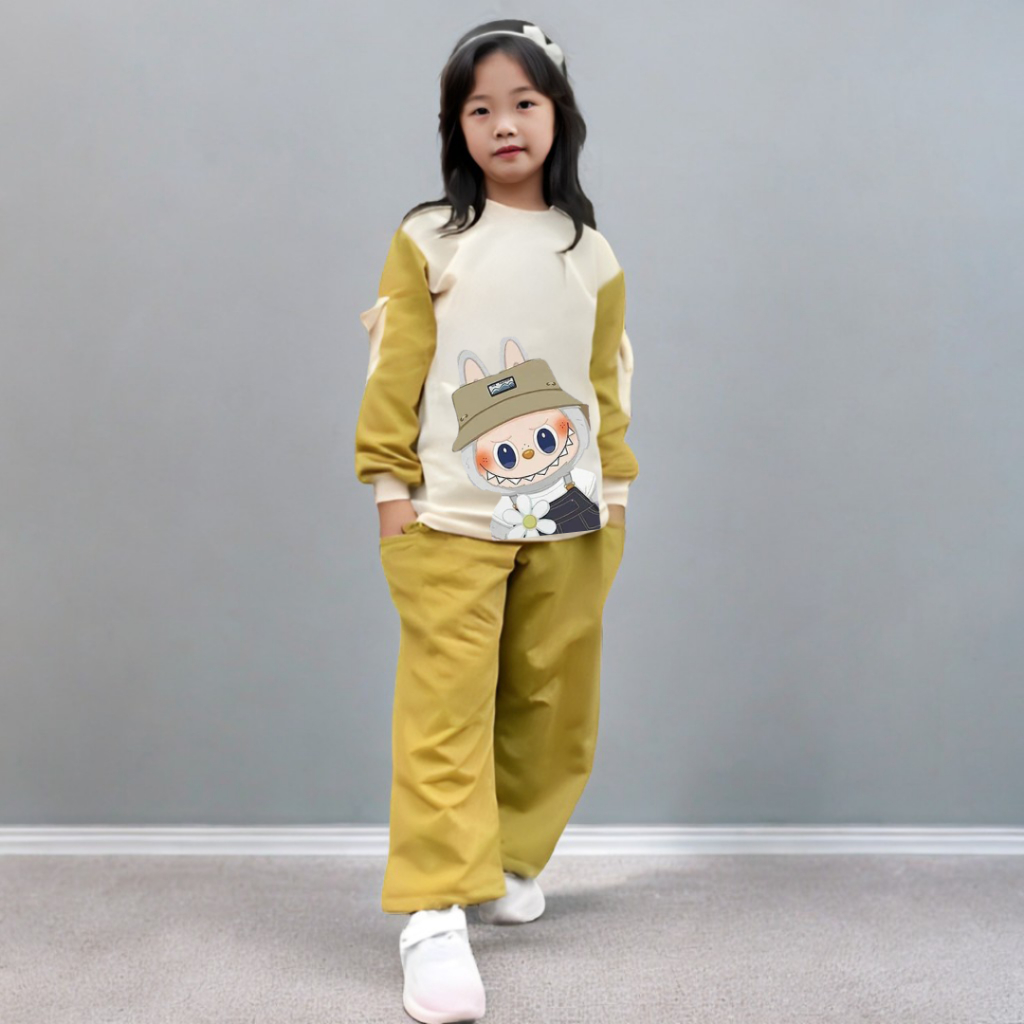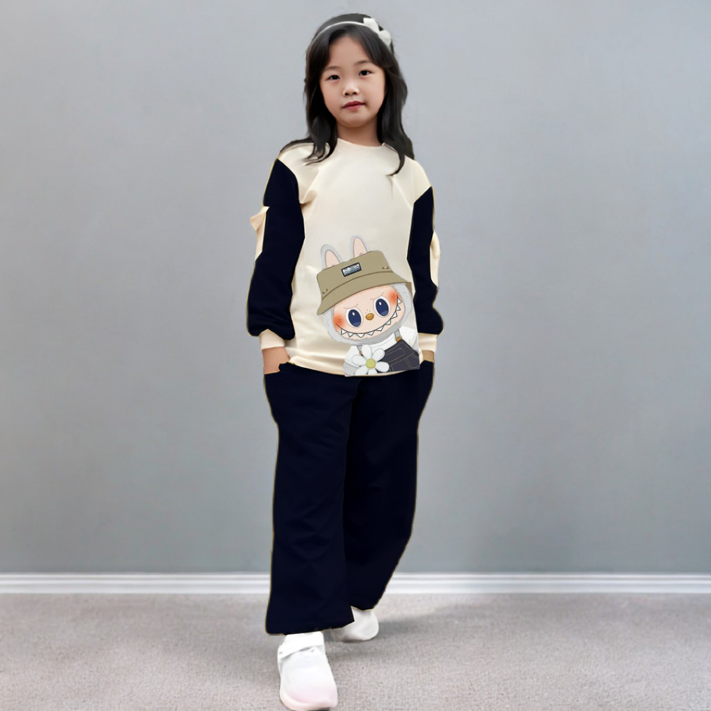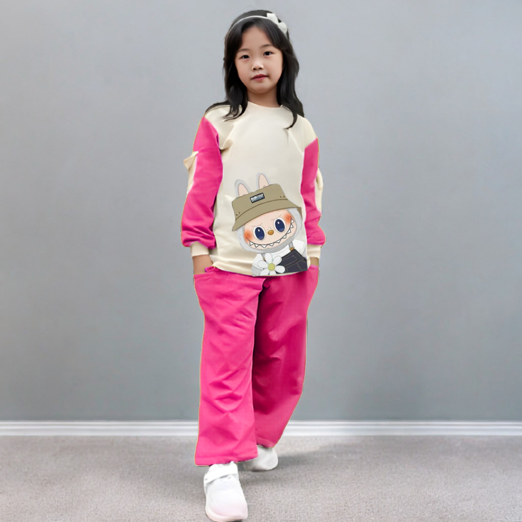 Setelan Baju Anak Perempuan Set Cargo Kartun Labubu Terbaru Usia 5-12 Tahun Celana Cargo Terbaru