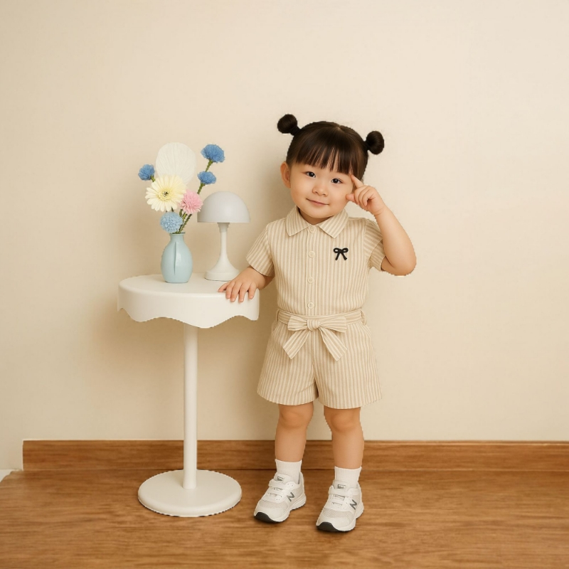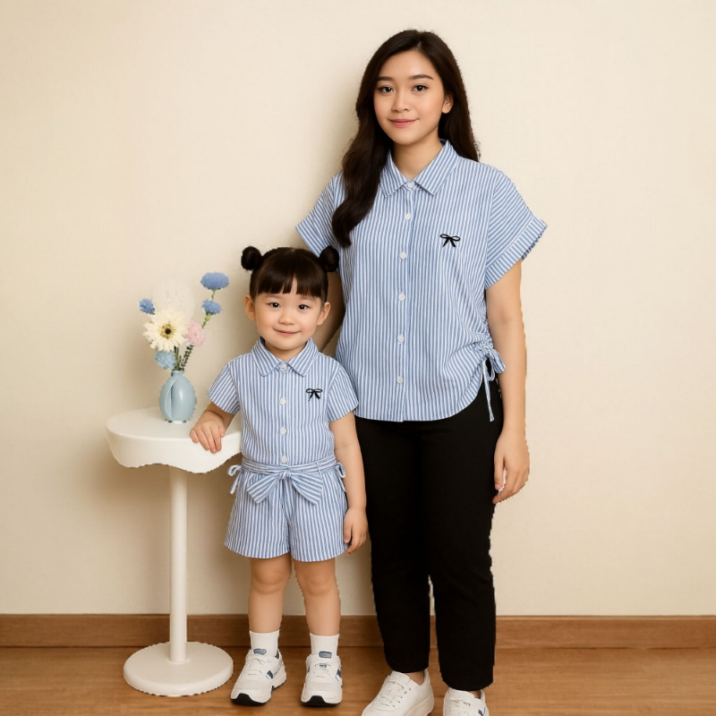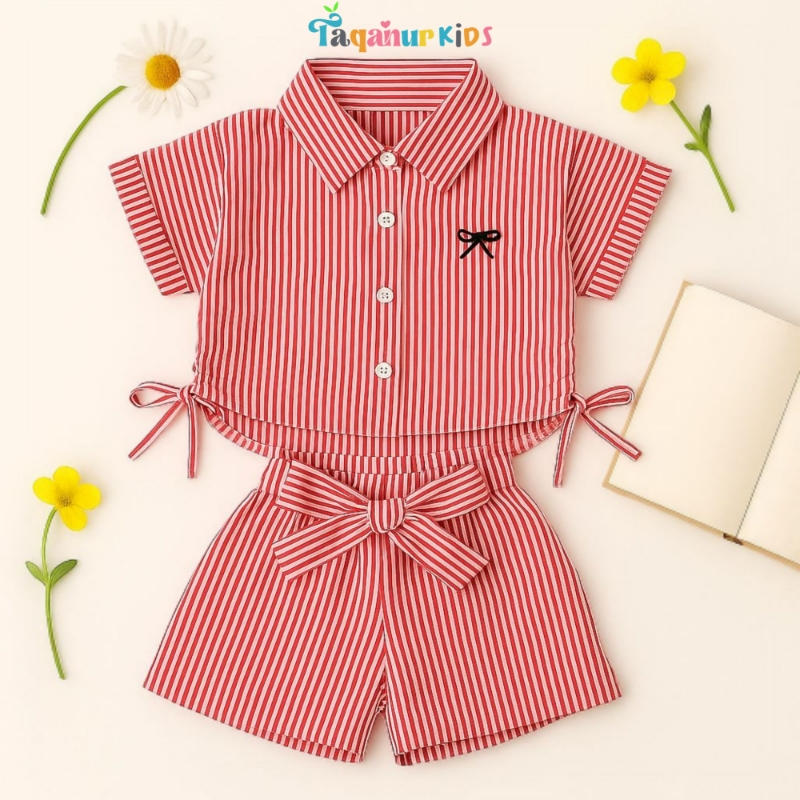 NOVARIA SET - Setelan Anak Perempuan Stripe Shirt Kemeja Katun Salur One Set Motif Salur Bordir Pita